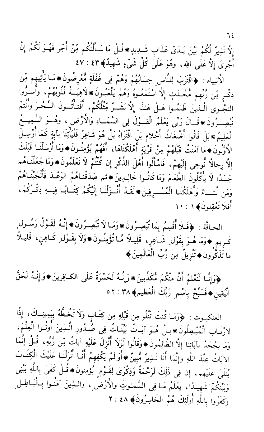 العنكبوت: {وَمَا كُنْتَ تَتْلُو مِنْ قَبْلِهِ مِنْ كِتَابٍ وَلَا تَخُطُّهُ بِيَمِينِكَ إِذًا لَارْتَابَ الْمُبْطِلُونَ (48) بَلْ هُوَ آيَاتٌ بَيِّنَاتٌ فِي صُدُورِ الَّذِينَ أُوتُوا الْعِلْمَ وَمَا يَجْحَدُ بِآيَاتِنَا إِلَّا الظَّالِمُونَ (49) وَقَالُوا لَوْلَا أُنْزِلَ عَلَيْهِ آيَاتٌ مِنْ رَبِّهِ قُلْ إِنَّمَا الْآيَاتُ عِنْدَ اللَّهِ وَإِنَّمَا أَنَا نَذِيرٌ مُبِينٌ (50) أَوَلَمْ يَكْفِهِمْ أَنَّا أَنْزَلْنَا عَلَيْكَ الْكِتَابَ يُتْلَى عَلَيْهِمْ إِنَّ فِي ذَلِكَ لَرَحْمَةً وَذِكْرَى لِقَوْمٍ يُؤْمِنُونَ (51) قُلْ كَفَى بِاللَّهِ بَيْنِي وَبَيْنَكُمْ شَهِيدًا يَعْلَمُ مَا فِي السَّمَاوَاتِ وَالْأَرْضِ وَالَّذِينَ آمَنُوا بِالْبَاطِلِ وَكَفَرُوا بِاللَّهِ أُولَئِكَ هُمُ الْخَاسِرُونَ} 48: 52.