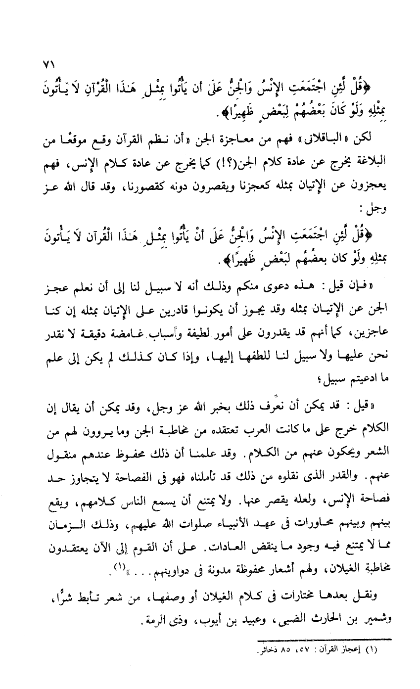 لكن "الباقلانى" فهم من معاجزة الجن "أن نظم القرآن وقع موقعاً من البلاغة يخرج عن عادة كلام الجن (؟!) كما يخرج عن عادة كلام الإنس، فهم يعجزون عن الإتيان بمثله كعجزنا ويقصرون دونه كقصورنا، وقد قال الله - عز وجل -: