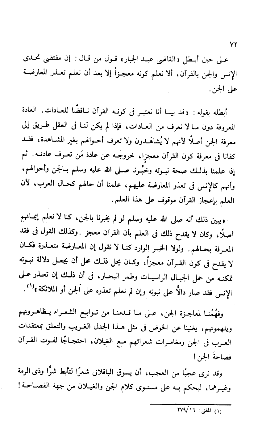 "يبين ذلك أنه - صلى الله عليه وسلم - لو لم يخبرنا بالجن، كنا لا نعلم إيمانهم أصلاً، وكان لا يقدح ذلك في العلم بأن القرآن معجز. وكذلك القول في فقد المعرفة بحالهم. ولولا الخبر الوارد كنا لا نقول إن المعارضة متعذرة فكان لا يقدح في كون القرآن معجزاً، وكان يحل ذلك محل أن يجعل دلالة نبوته تمكنه من حمل الحبال الراسيات وطمر البحار، في أن ذلك إن تعذر على الإنس فقد صار دالاً على نبوته وإن لم نعلم تعذره على الجن أو الملائكة".