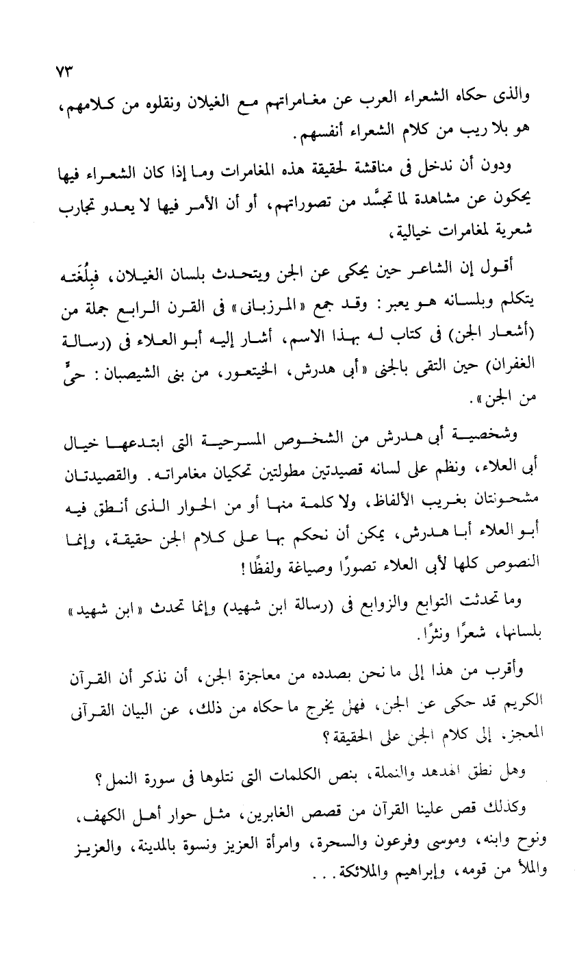 أقول إن الشاعر حين يحكي عن الجن ويتحدث بلسان الغيلان، فبِلُغَته يتكلم وبلسانه هو يعبر: وقد جمع "المرزبانى" في القرن الرابع جملة من (أشعار الجن) في كتاب له بهذا الاسم، أشار إليه أبو العلاء في (رسالة الغفران) حين التقى بالجني "أبي هدرش، الخيتعور، من بني الشيصبان: حيَّ من الجن".