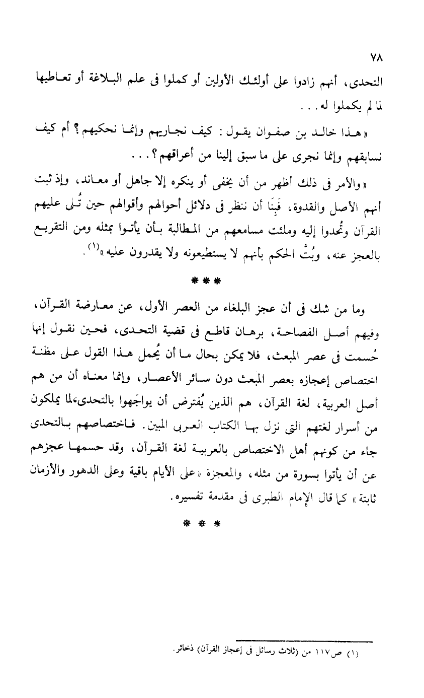 "والأمر في ذلك أظهر من أن يخفى أو ينكره إلا جاهل أو معاند، وإذ ثبت أنهم الأصل والقدوة، فَبِنَا أن ننظر في دلائل أحوالهم وأقوالهم حين تُلى عليهم القرآن وتُحدوا إليه وملئت مسامعهم من المطالبة بأن يأتوا بمثله ومن التقريع بالعجز عنه، وبُتَّ الحكم بأنهم لا يستطيعونه ولا يقدرون عليه".