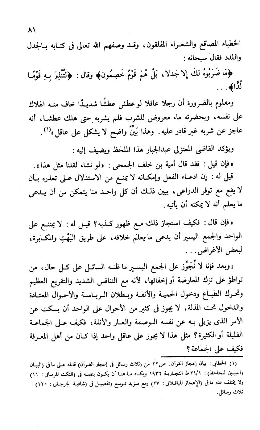 "فإن قيل: فقد قال أمية بين خلف الجمحي: "لو نشاء لقلنا مثل هذا". قيل له: إن إدعاء الفعل وإمكانه لا يمنع من الاستدلال على تعذره بأن لا يقع مع توفر الدواعي، يبين لذلك أن كل واحد منا يتمكن من أن يدعى ما يعلم أنه لا يمكنه أن يأتيه.