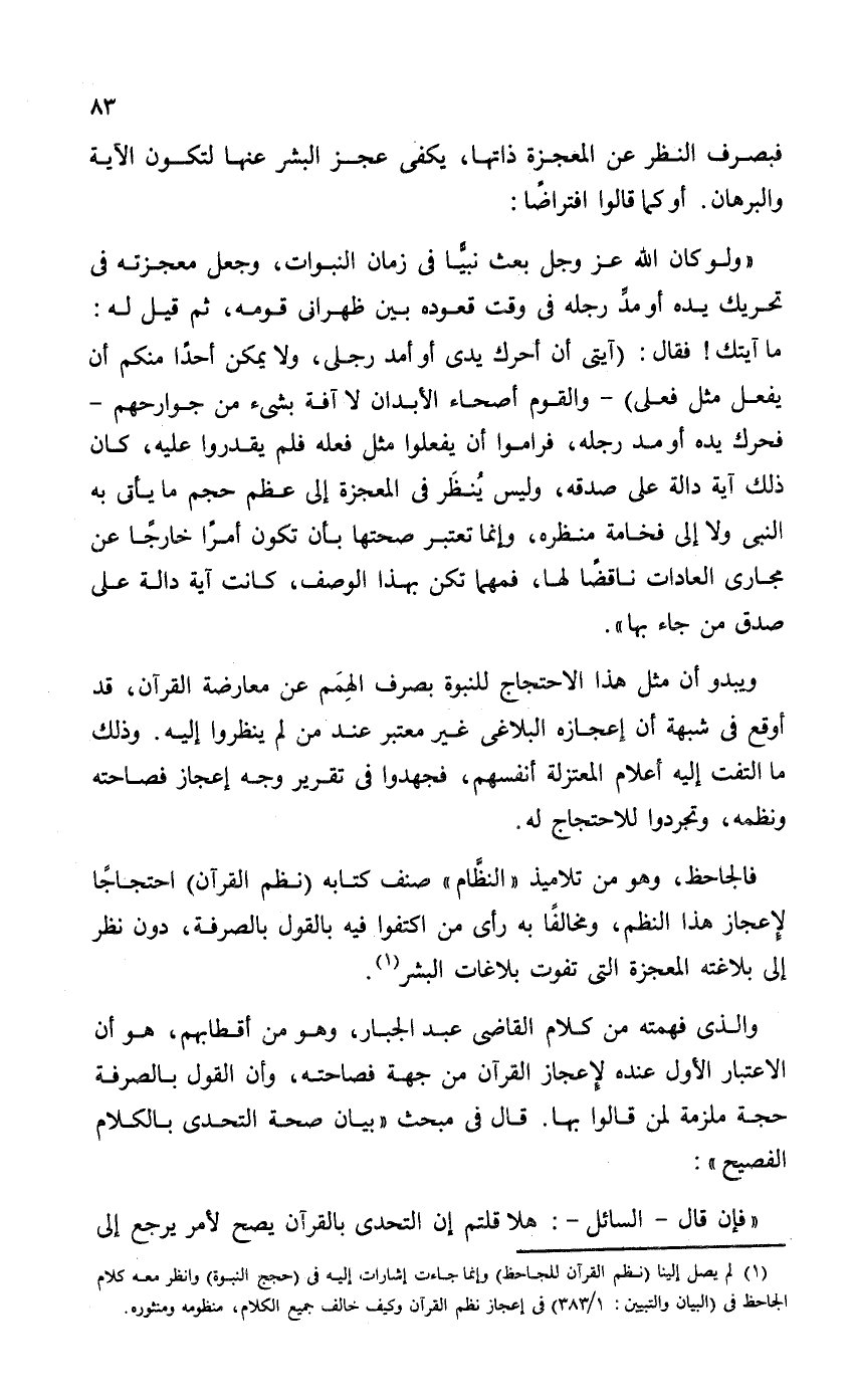 فالجاحظ، وهو من تلاميذ "النظَّام" صنف كتابه (نظم القرآن) احتجاجاً لإعجاز هذا النظم، ومخالفاً به رأي من أكتفوا فيه بالقول بالصرفة، دون نظر إلى بلاغته المعجزة التي تفوت بلاغات البشر.