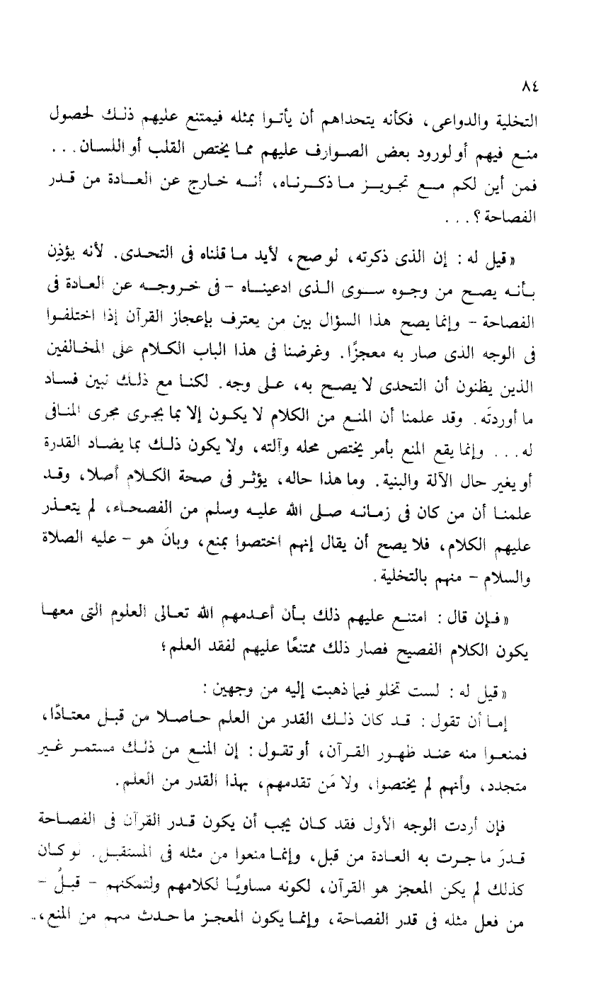 "قيل له: 'ن الذي ذكرته، لو صح، لأيد ما قلناه في التحدي. لأنه يؤذِن بأنه يصح من وجوه سوى الذي ادعيناه - في خروجه عن العادة في الفصاحة - وإنما يصح هذا السؤال بين من يعترف بإعجاز القرآن إذا اختلفوا في الوجه الذي صار به معجزاً. وغرضنا في هذا الباب الكلام على المخالفين الذين يظنون أن التحدي لا يصح به، على وجه، لكنا مع ذلك نبين فساد ما أوردتَه. وقد علمنا أن المنع من الكلام لا يكون إلا بما يجرى مجرى المنافي له. . . وإنما يقع المنع بأمر يختص محله وآلته، ولا يكون ذلك بما يضاد القدرة أو يغير حال الآلة والبنية. وما هذا حاله، يؤثر في صحة الكلام أصلاً، وقد علمنا أن من كان في زمانه - صلى الله عليه وسلم - من الفصحاء، لم يعتذر عليهم الكلام، فلا يصح أن يقال إنهم اختصوا بمنع، وبانَ هو - عليه الصلاة والسلام - منهم بالتخلية.