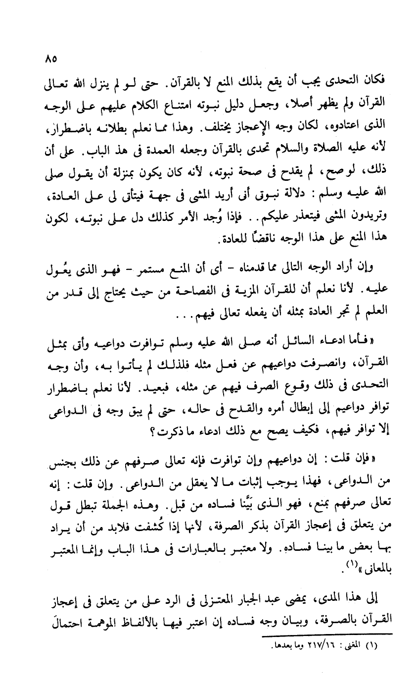 "فإن قلت: إن دواعيهم وإن توافرت فإنه تعالى صرفهم عن ذلك بجنس من الدواعي، فهذا يوجب إثبات ما لا يعقل من الدواعي. وإن قلت: إنه تعالى صرفهم بمنع، فهو الذي بَيَّنا فساده من قبل. وهذا الجملة تبطل قول من يتعلق في إعجاز القرآن بذكر الصرفة، لأنها إذا كُشفت فلابد من أن يراد بها بعض ما بينا فساده. ولا معتبر بالعبارات في هذا الباب وإنما المعتبر بالمعاني".