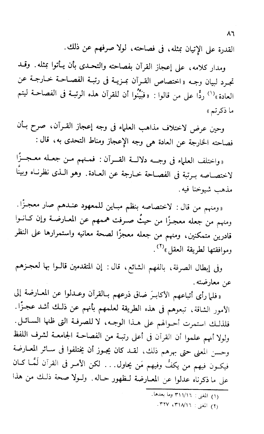 "ومنهم من قال: لاختصاصه بنظم مباين للمعهود عندهم صار معجزاً. ومنهم من جعله معجزاً من حيثُ صرفت همهم عن المعارضة وإن كانوا قادرين متمكنين، ومنهم من جعله معجزاً لصحة معانيه واستمرارها على النظر وموافقتها لطريقة العقل".