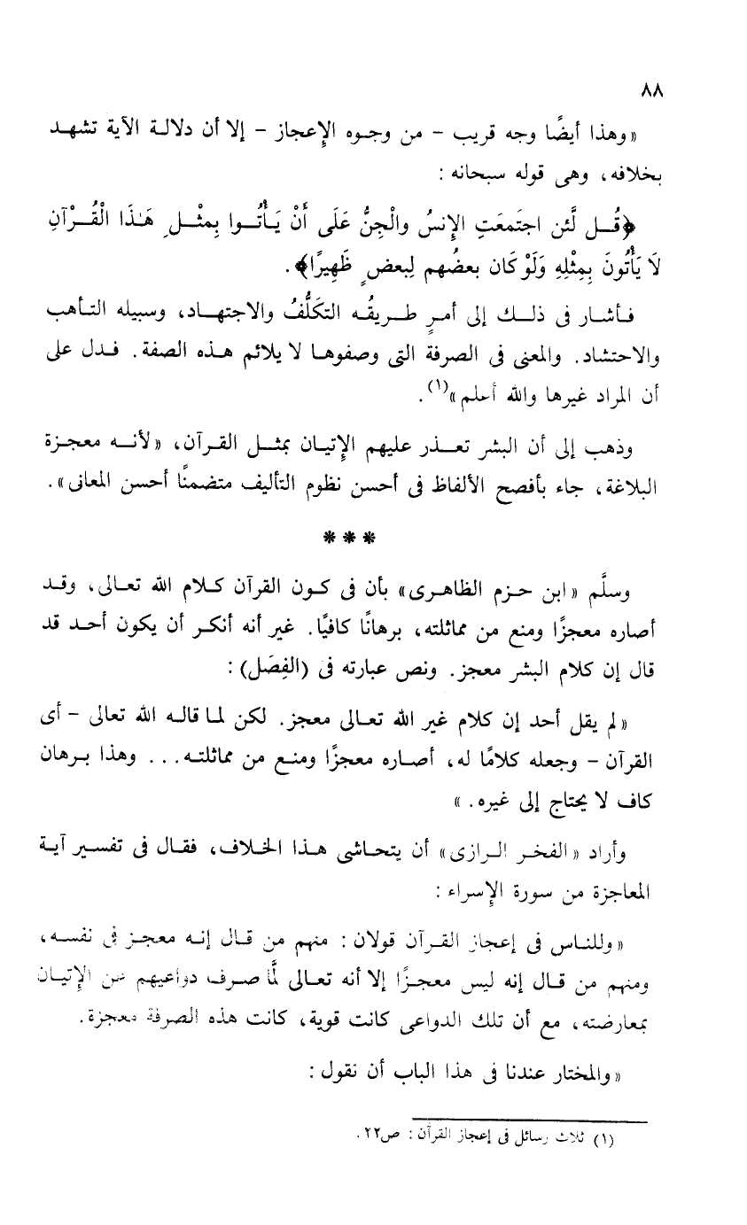 "لم يقل أحد إن كلام غير الله تعالى معجز. لكن لما قاله الله تعالى - أي القرآن - وجعله كلاماً له، أصاره معجزاً ومنع من مماثلته. . . وهذا برهان كاف لا يحتاج إلى غيره".