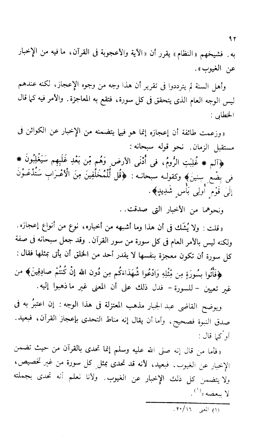 به. فشيخهم "النظام" يقرر أن "الآية والأعجوبة في القرآن، ما فيه من الإخبار عن الغيوب".