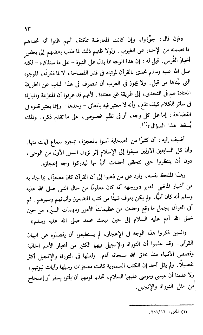 "فإن قال: جوَّزوا، وإن كانت المعارضة ممكنة، أنهم ظنوا أنه تحداهم بما تضمنه من الإخبار عن الغيوب. ولولا ظنهم ذلك لما طلب بعضهم إلى بعض أخبارَ الفرُس. قيل له: إن هذا الوجه مما يدل على النبوة - على ما سنذكره - لكنه - صلى الله عليه وسلم - تحدى بالقرآن لمرتبته في قدر الفصاحة، لا لما ذكرتَه، للوجوه التي بيَّناها من قبل. ولا يجوز في العرب أن تنصرف في هذا الباب عن الطريقة المعتادة لهم في التحدي، إلى طريقة غير معتادة. لأنهم قد عرفوا أن المنازعة والمباراة في سائر الكلام كيف تقع، وأنه لا معتبر فيه بالمعاني - وحدها - وإنما يعتبر قدوه في الفصاحة: إما على كل وجه، أو في نظم مخصوص، على ما تقدم ذكره. وذلك يُسقط هذا السؤال".
