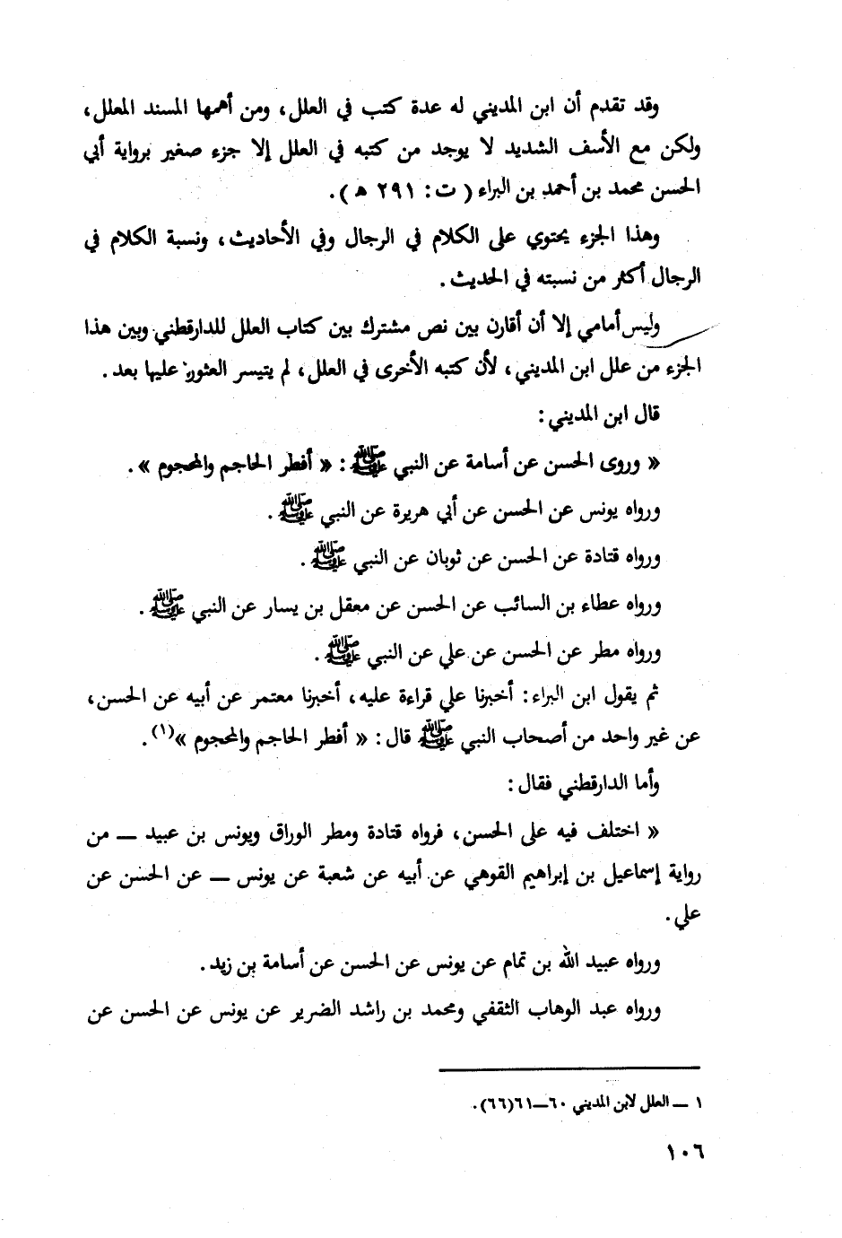 قال ابن المديني: " وروى الحسن عن أُسامة عنِ النَّبي صَلى اللَّهُ عَليه وسَلمَ: " أَفْطَرَ الْحَاجِمُ وَالْمَحْجُومُ ".