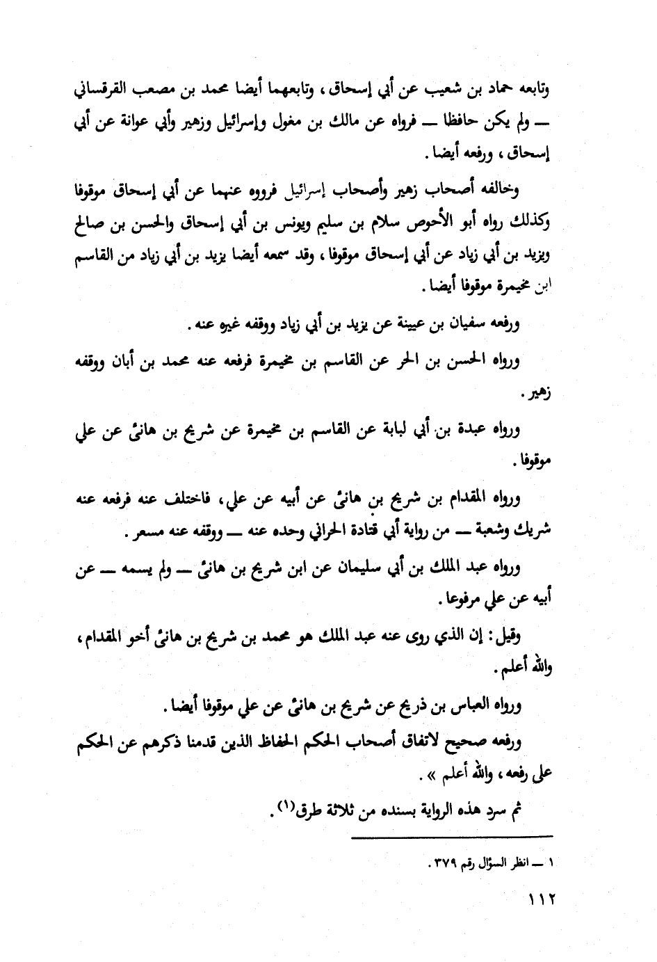 وخالَفَه أَصحابُ زُهير وأَصحاب إِسْرَائِيلَ فَرَوَوْهُ عَنْهُمَا عَن أَبي إِسحاق مَوقوفًا وَكَذَلِكَ رَواه أَبو الْأَحْوَصِ سَلاَّم بْنُ سُلَيْم ويونُس بْنُ أَبي إِسحاق وَالْحَسَنُ بْنُ صَالِحٍ وَيَزِيدُ بْنُ أَبي زِيَادٍ عَن أَبي إِسحاق مَوقوفًا، وَقَدْ سَمِعَهُ أَيْضًا يَزِيدُ بْنُ أَبي زِيَادٍ من القاسم ابن مُخَيْمِرَةَ مَوقوفًا أَيضًا.