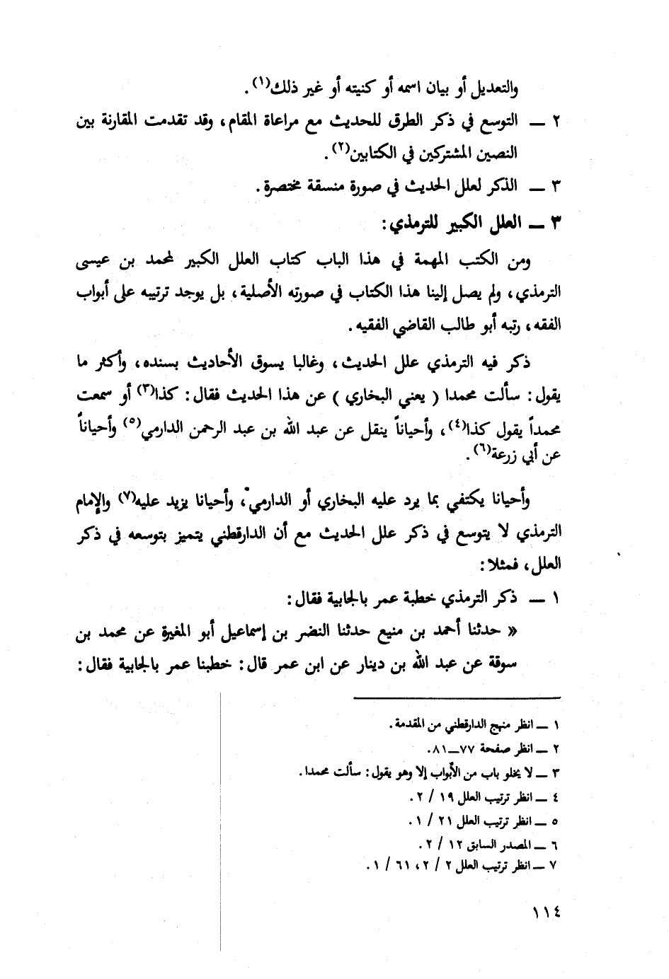 وأحيانا يكتفي بما يرد عليه البخاري أَو الدارمي، وأحيانا يزيد عليه (7) والإمام الترمذي لا يتوسع في ذكر علل الحديث مع أن الدارقطني يتميز بتوسعه في ذكر العلل، فمثلا: 1 - ذكر الترمذي خطبة عمر بالجابية فقال: " حَدَّثنا أَحمد بن مينع حَدَّثَنا النضر بن إسماعيل أَبو المغيرة عَنْ مُحمد بْنِ سُوقَةَ عَنْ عَبد اللَّهِ بْنِ دِينَارٍ عَن ابْنِ عُمَر قال: خطبنا عمر بالجابية فقال: