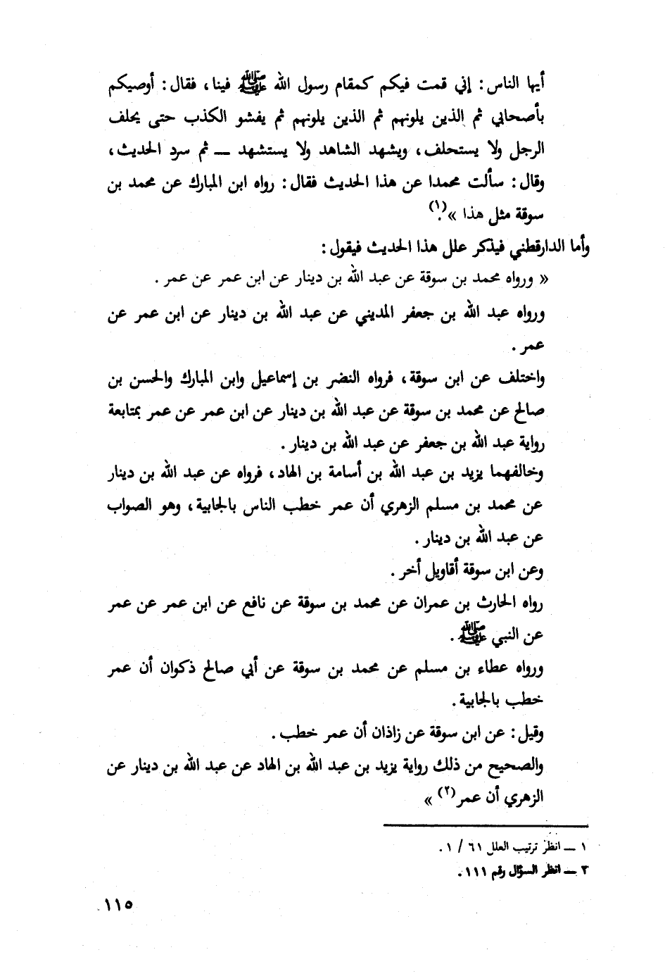 أيها الناس: إني قمت فيكم كمقام رسول الله صَلى الله عَليه وسَلمَ فينا، فقال: أوصيكم بأَصحابي ثُمَّ الَّذِينَ يَلُونَهُمْ ثُمَّ الَّذِينَ يَلُونَهُمْ ثُمَّ يفشو الكذب حتى يخلف الرجل ولا يستحلف، ويشهد الشاهد ولا يستشهد - ثم سرد الحديث، وقال: سأَلت مُحمدا عن هذا الحديث فقال: رَواه ابن المُبارك عن مُحمد بن سوقة مثل هذا (1) ".