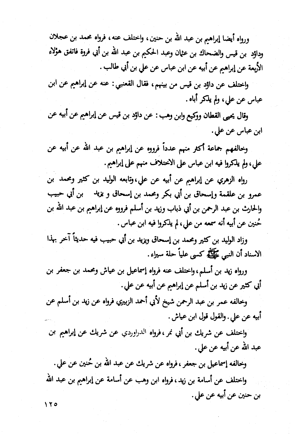 وَرَوَاهُ أَيْضًا إِبراهيم بْنُ عَبد اللَّهِ بْنُ حُنَيْنٍ، واختُلِفَ عَنْهُ، فَرَوَاهُ مُحمد بْنُ عَجلاَن وداؤد بْنُ قَيْسٍ وَالضَّحَّاكُ بْنُ عُثمان وعَبد الْحَكِيمِ بْنُ عَبد اللَّهِ بْنِ أَبي فَرْوَةَ فَاتَّفَقَ هَؤُلَاءِ الْأَرْبَعَةُ عَنْ إِبراهيم عَن أَبيه عَن ابْنِ عَبَّاس عَن عَلِيِّ بْنِ أَبي طَالِبٍ.