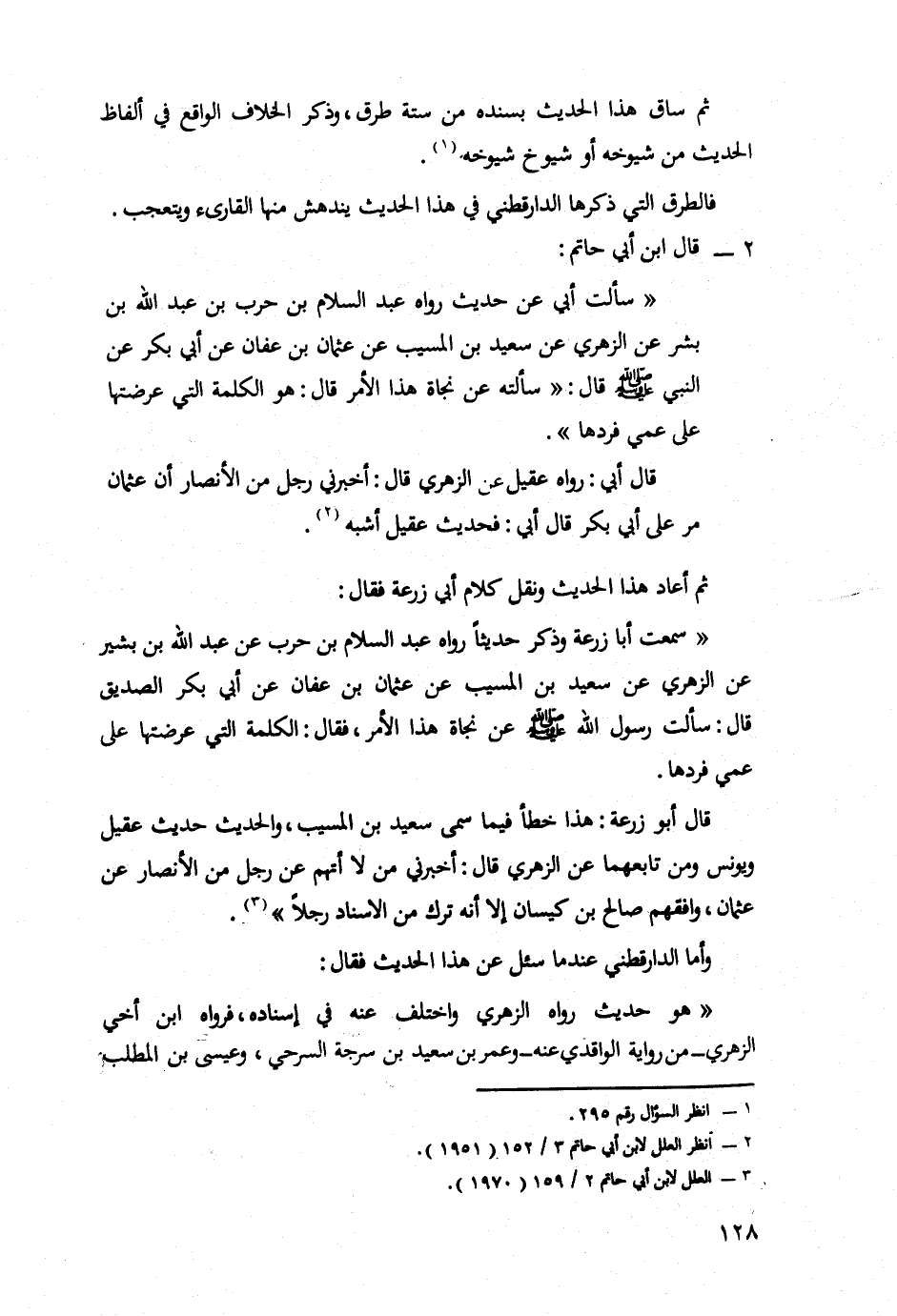 " سمعت أبا زُرْعَة وذكر حديثا رَواه عَبد السلام بن حرب عن عَبد الله بْنِ بَشِيرٍ عَنِ الزُّهْرِي عَن سَعيد بْنِ المُسيَّب عَنْ عُثمان بن عفان عَن أَبي بكر الصِّدّيق قال: سأَلت رَسُولَ اللَّهِ صَلى اللَّهُ عَليه وسَلمَ عن نجاة هذا الامر، فقال: الكلمة التي عرضتها على عمي فردها.