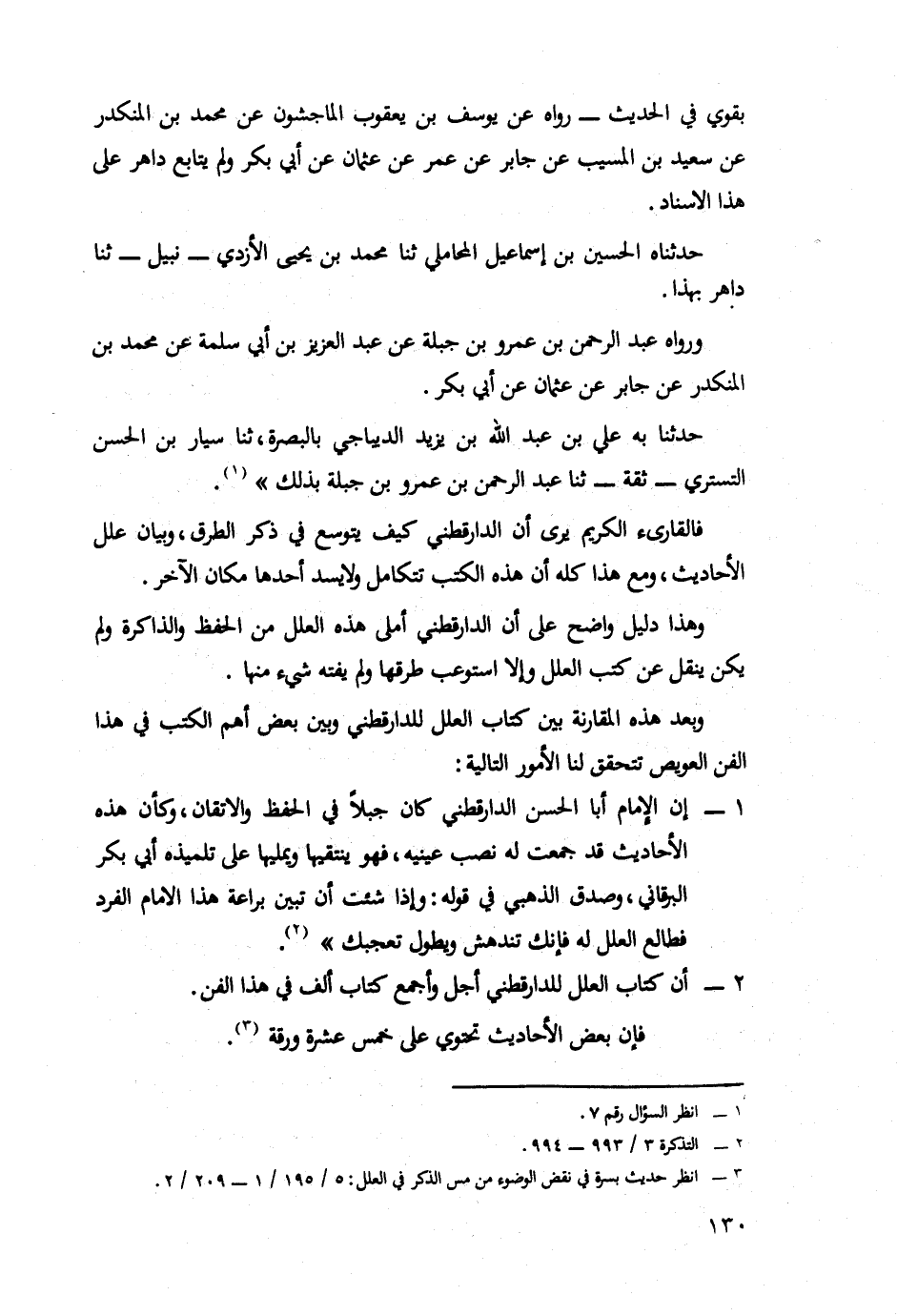 وبعد هذه المقارنة بين كتاب العلل الدارقطني وبين بعض أهم الكتب في هذا الفن العويص تتحقق لنا الامور التالية: 1 - إِن الإمام أبا الحسن الدارقطني كان جبلا في الحفظ والاتقان، وكأن هذه الأَحاديث قد جمعت له نصب عينيه، فهو ينتقيها ويمليها على تلميذه أَبي بكر البرقاني، وصدق الذهبي في قوله: وإذا شئت أن تبين براعة هذا الإمام الفرد فطالع العلل له فإنك تندهش ويطول تعجبك " (2) .