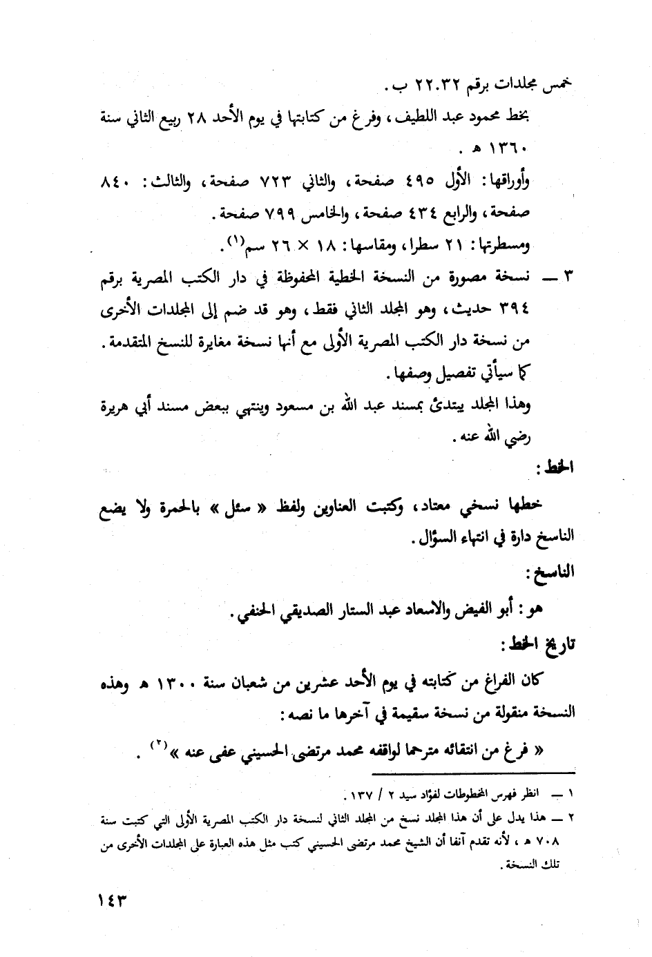 2 - هذا يدل على أن هذا المجلد نسخ من المجلد الثاني لنسخة دار الكتب المصرية الاولى التي كتبت سنة 708 هـ، لانه تقدم آنفا أن الشيخ محمد مرتضى الحسيني كتب مثل هذه العبارة على المجلدات الاخرى من تلك النسخة.