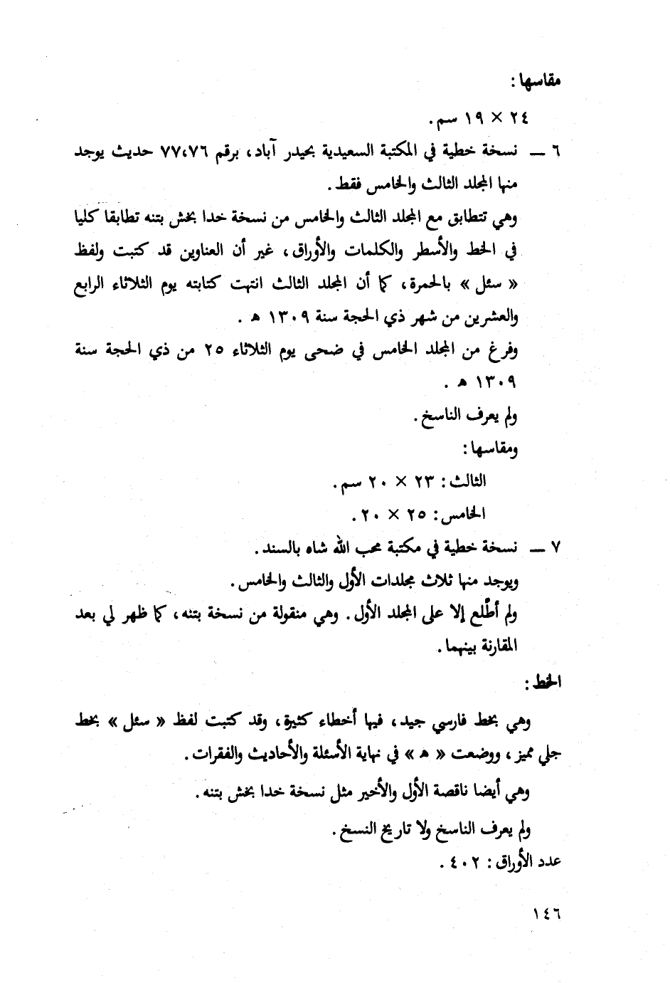 وهي تتطابق مع المجلدات الثالث والخامس من نسخة خدا بخش بتنه تطابقا كليا في الخط والاسطر والكلمات والاوراق، غير أن العناوين قد كتبت ولفظ " سئل " بالحمرة، كما أن المجلد الثالث انته كتابته يوم الثلاثاء الرابع والعشرين من شهر ذي الحجة سنة 1309 هـ.