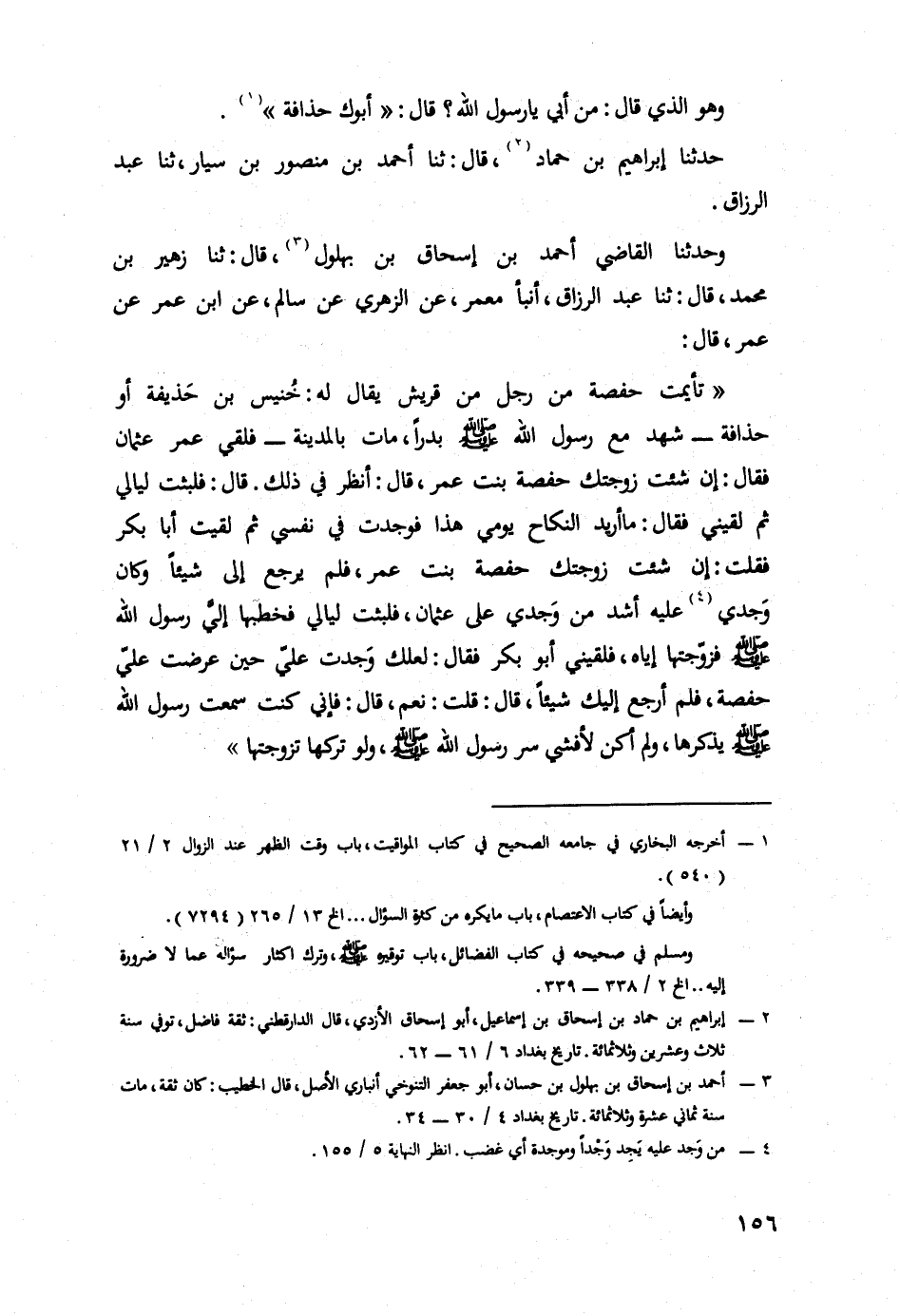 حدثنا إبراهيم بن حماد، قال: حدثنا أحمد بن منصور بن سيار حدثنا عبد الرزاق (ح) وَحَدَّثَنَا الْقَاضِي أَحْمَدُ بْنُ إِسْحَاقَ بْنِ بُهْلُولٍ، قال: حدثنا زهير بن محمد، قال: حدثنا عَبْدُ الرَّزَّاقِ أَنْبَأَنَا مَعْمَرٌ، عَنِ الزُّهْرِيِّ، عَنِ سَالِمٍ، عَنِ ابْنِ عُمَرَ، عَنْ عُمَرَ قَالَ: تَأَيَّمَتْ حَفْصَةُ مِنْ رَجُلٍ مِنْ قُرَيْشٍ يُقَالُ لَهُ خُنَيْسُ بْنُ حُذَيْفَةَ، أَوْ حُذَافَةَ شَهِدَ مَعَ رَسُولِ اللَّهِ صَلَّى اللَّهُ عَلَيْهِ وَسَلَّمَ بَدْرًا مَاتَ بِالْمَدِينَةِ فَلَقِيَ عُمَرُ عُثْمَانَ فَقَالَ إِنْ شِئْتَ زَوَّجْتُكَ حَفْصَةَ بِنْتَ عُمَرَ قَالَ أَنْظُرُ فِي ذَلِكَ قَالَ فَلَبِثْتُ لَيَالِيَ ثُمَّ لَقِيَنِي فَقَالَ مَا أُرِيدُ النِّكَاحَ يَوْمِي هَذَا فَوَجَدْتُ فِي نَفْسِي ثُمَّ لَقِيتُ أَبَا بَكْرٍ فَقُلْتُ إِنْ شِئْتَ زَوَّجْتُكَ حَفْصَةَ بِنْتَ عُمَرَ فَلَمْ يَرْجِعْ إِلَيَّ شَيْئًا وَكَانَ وَجْدِي عَلَيْهِ أَشَدَّ مِنْ وَجْدِي عَلَى عُثْمَانَ فَلَبِثْتُ لَيَالِيَ فَخَطَبَهَا إِلَيَّ رَسُولُ اللَّهِ صَلَّى اللَّهُ عَلَيْهِ وَسَلَّمَ فَزَوَّجْتُهَا إِيَّاهُ فَلَقِيَنِي أَبُو بَكْرٍ فَقَالَ لَعَلَّكَ وَجَدْتُ عَلَيَّ حِينَ عَرَضْتَ عَلَيَّ حَفْصَةَ فَلَمْ أَرْجِعْ إِلَيْكَ شَيْئًا قَالَ قُلْتُ نَعَمْ قَالَ فَإِنِّي كُنْتُ سَمِعْتُ رَسُولَ اللَّهِ صَلَّى اللَّهُ عَلَيْهِ وَسَلَّمَ يَذْكُرُهَا وَلَمْ أَكُنْ لِأُفْشِيَ سِرَّ رَسُولِ اللَّهِ صَلَّى اللَّهُ عَلَيْهِ وَسَلَّمَ وَلَوْ تَرَكَهَا تَزَوَّجْتُهَا
