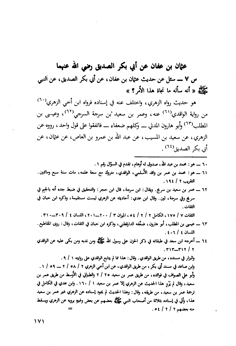 7- سُئِلَ عَنْ حَدِيثِ عُثْمَانَ بْنِ عَفَّانَ، عَنْ أَبِي بَكْرٍ الصِّدِّيقِ، عَنِ النَّبِيِّ صَلَّى اللَّهُ عَلَيْهِ وَسَلَّمَ؛ أَنَّهُ سَأَلَهُ مَا نَجَاةُ هَذَا الْأَمْرِ؟.