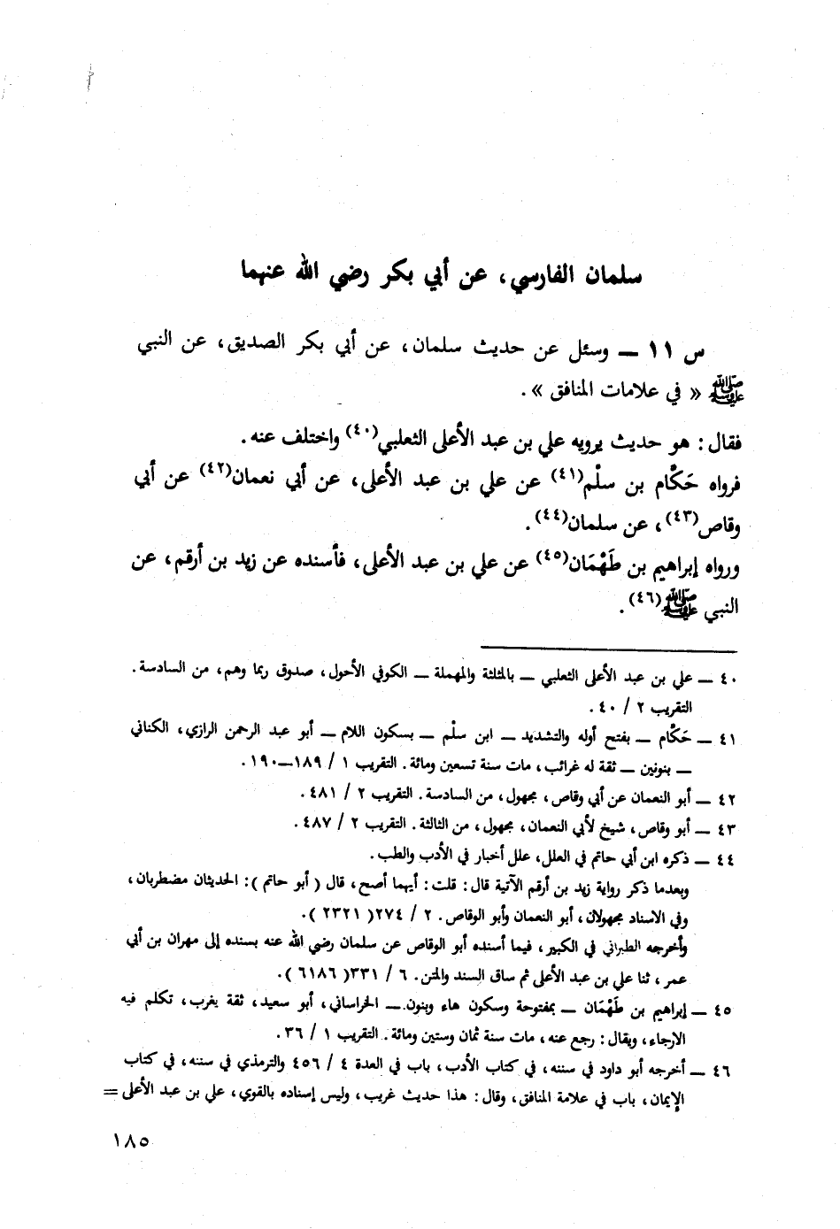 11- وَسُئِلَ عَنْ حَدِيثِ سَلْمَانَ، عَنْ أَبِي بَكْرٍ الصِّدِّيقِ، عَنِ النَّبِيِّ صَلَّى اللَّهُ عَلَيْهِ وَسَلَّمَ؛ فِي عَلَامَاتِ الْمُنَافِقِ.