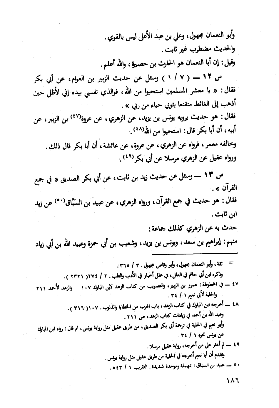 12- وَسُئِلَ عَنْ حَدِيثِ الزُّبَيْرِ بْنِ الْعَوَّامِ، عَنْ أَبِي بَكْرٍ فَقَالَ يَا مَعْشَرَ الْمُسْلِمِينَ اسْتَحْيُوا مِنَ اللَّهِ فَوَالَّذِي نَفْسِي بِيَدِهِ إِنِّي لَأَظَلُّ حِينَ أَذْهَبُ إِلَى الْغَائِط مُتَقَنِّعًا بِثَوْبِي حَيَاءً مِنْ رَبِّي.