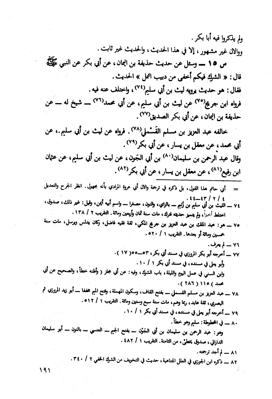 15- وَسُئِلَ عَنْ حَدِيثِ حُذَيْفَةَ بْنِ الْيَمَانِ، عَنْ أَبِي بَكْرٍ، عَنِ النَّبِيِّ صَلَّى اللَّهُ عَلَيْهِ وَسَلَّمَ، قَالَ: الشِّرْكُ فِيكُمْ أَخْفَى مِنْ دَبِيبِ النمل الحديث.