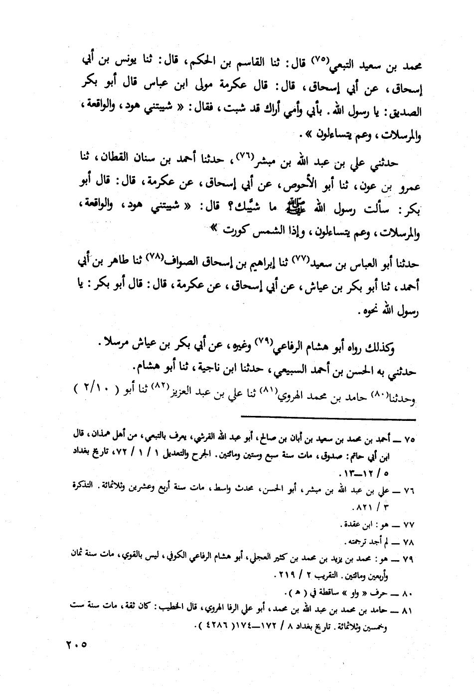 قال: حدثنا القاسم بن الحكم، قال: حدثنا يونس بن أبي إسحاق، عن أبي إسحاق، قَالَ: قَالَ عِكْرِمَةُ مَوْلَى ابْنِ عَبَّاسٍ، قَالَ أَبُو بَكْرٍ الصِّدِّيقُ يَا رَسُولَ اللَّهِ بِأَبِي وَأُمِّي أَرَاكَ قَدْ شِبْتَ، فَقَالَ: شَيَّبَتْنِي هُودٌ، وَالْوَاقِعَةُ، وَالْمُرْسَلَاتُ، وَعَمَّ يَتَسَاءَلُونَ.