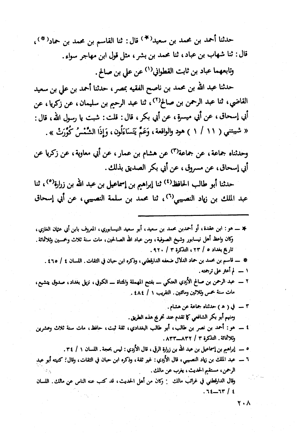 حَدَّثَنَا عَبْدُ اللَّهِ بْنُ مُحَمَّدِ بْنِ نَاصِحٍ الْفَقِيهُ بِمِصْرَ، حَدَّثَنَا أَحْمَدُ بن علي بن سعيد القاضي، حدثنا عبد الرحمن بن صالح، حدثنا عَبْدُ الرَّحِيمِ بْنُ سُلَيْمَانَ، عَنْ زَكَرِيَّا، عَنْ أَبِي إِسْحَاقَ، عَنْ أَبِي مَيْسَرَةَ، عَنْ أَبِي بَكْرٍ، قَالَ: قُلْتُ: شِبْتَ يَا رَسُولَ اللَّهِ، قَالَ: شَيَّبَتْنِي هُودٌ، وَالْوَاقِعَةُ، وَعَمَّ يَتَسَاءَلُونَ، وَإِذَا الشَّمْسُ كُوِّرَتْ.