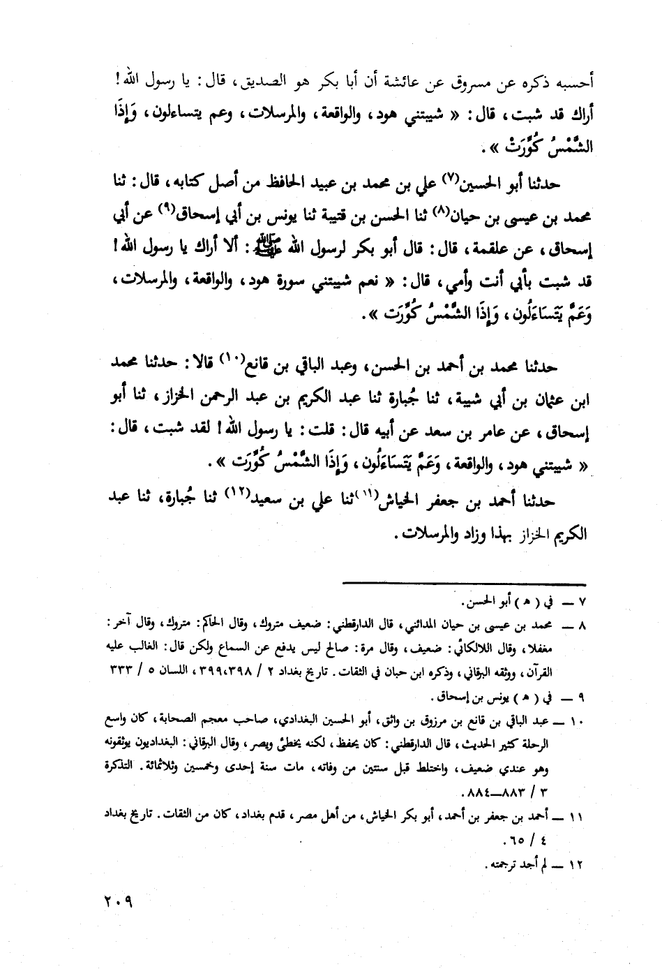 حَدَّثَنَا أَبُو الْحُسَيْنِ عَلِيُّ بْنُ مُحَمَّدِ بْنِ عبيد الحافظ مِنْ أَصْلِ كِتَابِهِ، قَالَ: حَدَّثَنَا مُحَمَّدُ بْنُ عيسى بن حيان، حدثنا الحسن بن قتيبة، حدثنا يونس بن أبي إسحاق، عن أبي إسحاق، عَنْ عَلْقَمَةَ، قَالَ: قَالَ أَبُو بَكْرٍ لِرَسُولِ اللَّهِ صَلَّى اللَّهُ عَلَيْهِ وَسَلَّمَ: أَلَا أَرَاكَ يَا رَسُولَ اللَّهِ قَدْ شِبْتَ بِأَبِي أَنْتَ وَأُمِّي، قَالَ: نَعَمْ، شَيَّبَتْنِي سُورَةُ هُودٍ، وَالْوَاقِعَةِ، والمرسلات، وعم يتساءلون، وإذا الشمس كورت.