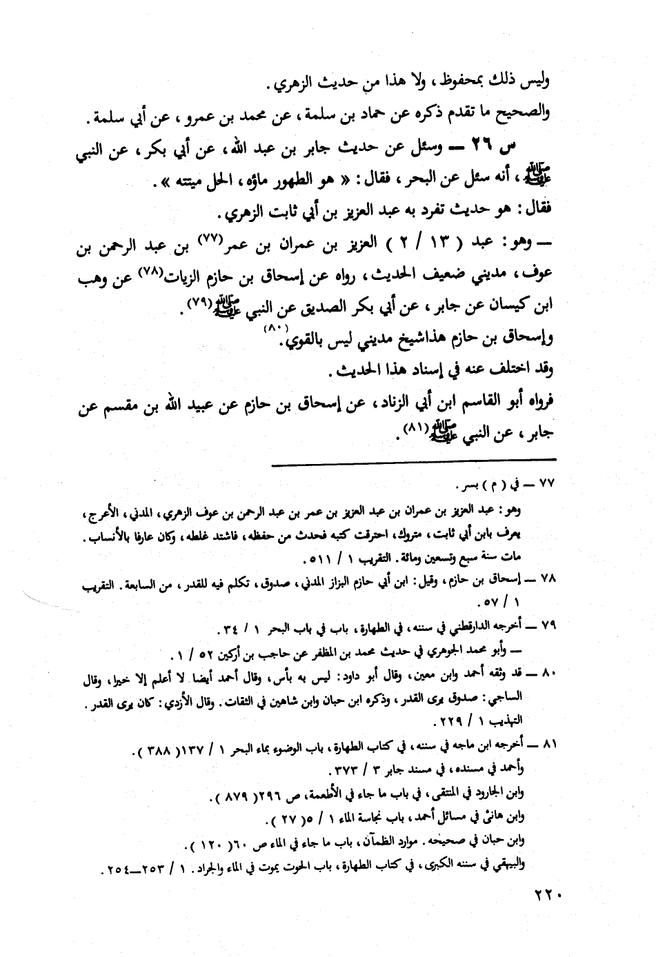 26- وَسُئِلَ عَنْ حَدِيثِ جَابِرِ بْنِ عَبْدِ اللَّهِ، عن أَبِي بَكْرٍ، عَنِ النَّبِيِّ صَلَّى اللَّهُ عَلَيْهِ وَسَلَّمَ، أَنَّهُ سُئِلَ عَنِ الْبَحْرِ، فَقَالَ: هُوَ الطَّهُورُ مَاؤُهُ، الْحِلُّ مَيْتَتُهُ.