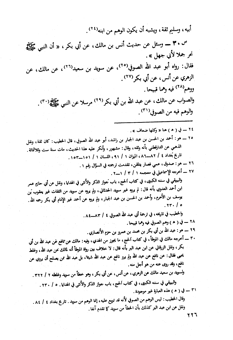30- وَسُئِلَ عَنْ حَدِيثِ أَنَسِ بْنِ مَالِكٍ، عَنْ أَبِي بَكْرٍ: أَنَّ النَّبِيَّ صَلَّى اللَّهُ عَلَيْهِ وَسَلَّمَ نَحَرَ جَمَلًا لِأَبِي جَهْلٍ.