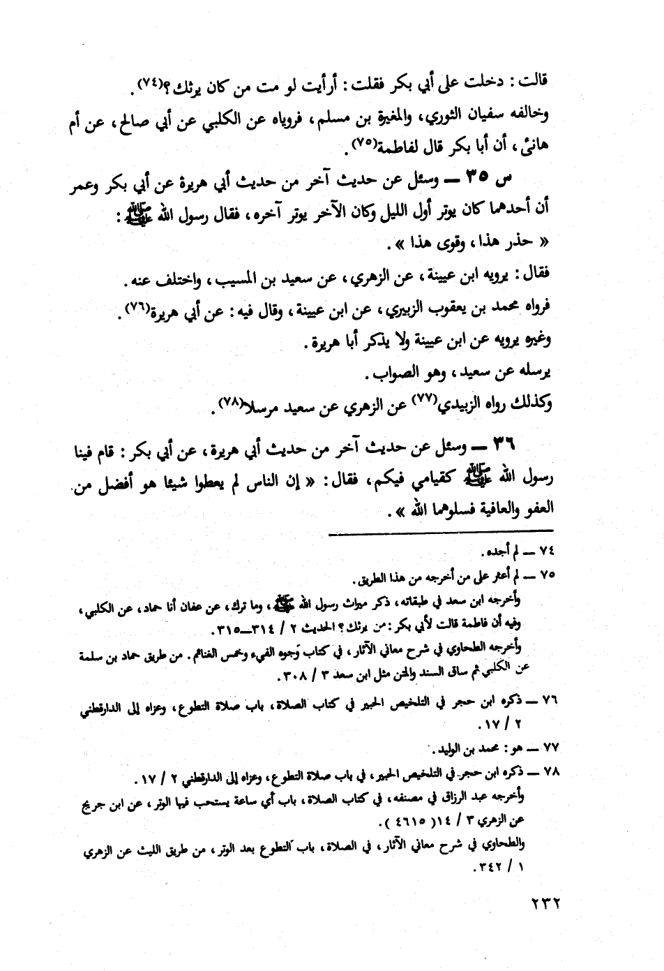35- وَسُئِلَ عَنْ حَدِيثٍ آخَرَ مِنْ حَدِيثِ أَبِي هُرَيْرَةَ، عَنْ أَبِي بَكْرٍ، وَعُمَرَ؛ أَنَّ أَحَدَهُمَا كَانَ يُوتِرُ أَوَّلَ اللَّيْلِ، وَكَانَ الْآخَرُ يُوتِرُ آخِرَهُ، فَقَالَ رَسُولُ اللَّهِ صَلَّى اللَّهُ عَلَيْهِ وَسَلَّمَ: حَذِرٌ هَذَا وَقَوِيٌ هَذَا.