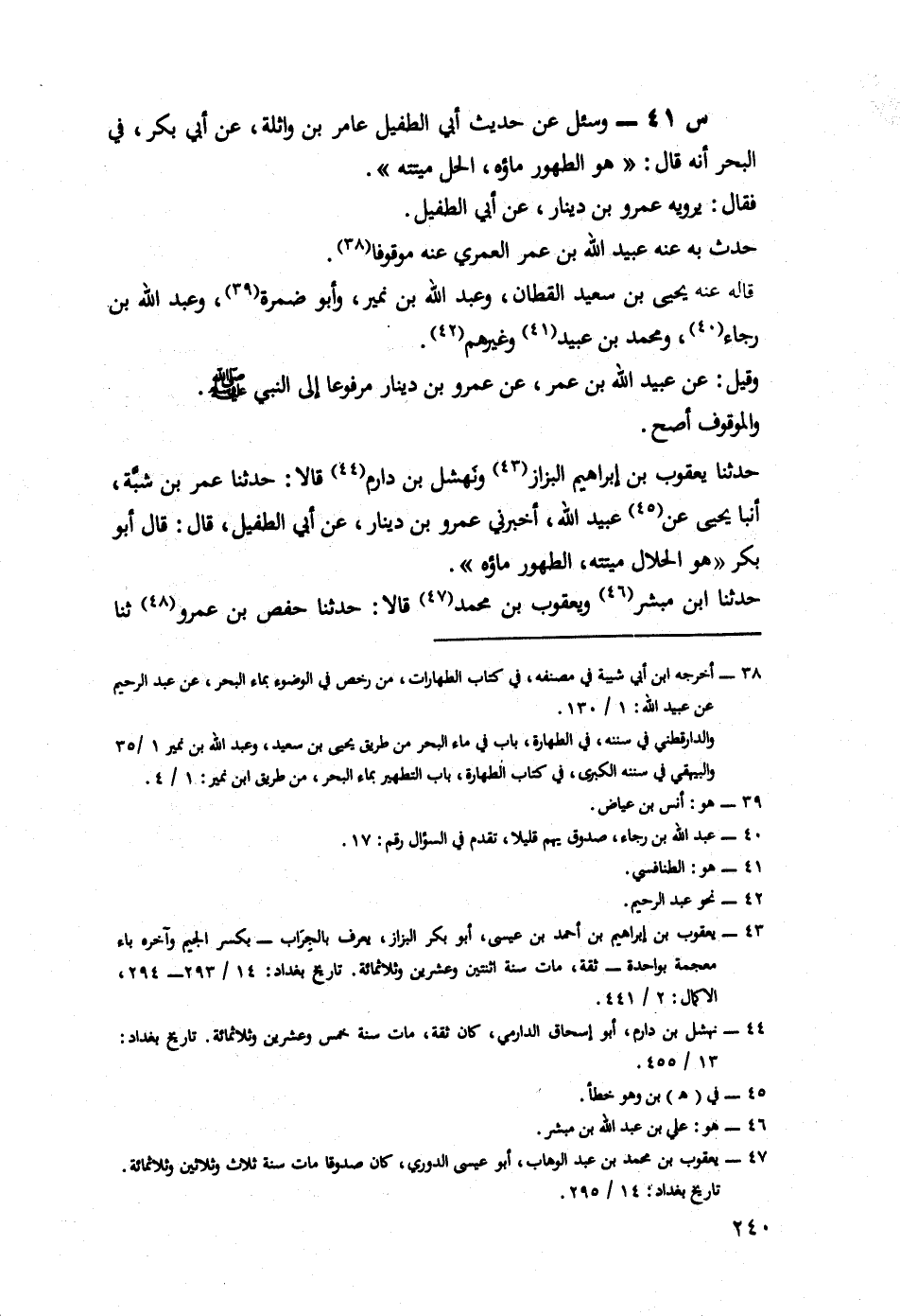 41- وَسُئِلَ عَنْ حَدِيثِ أَبِي الطُّفَيْلِ عَامِرِ بْنِ وَاثِلَةَ، عَنْ أَبِي بَكْرٍ فِي الْبَحْرِ أَنَّهُ قَالَ: هُوَ الطَّهُورُ مَاؤُهُ، الْحِلُّ مَيْتَتُهُ.