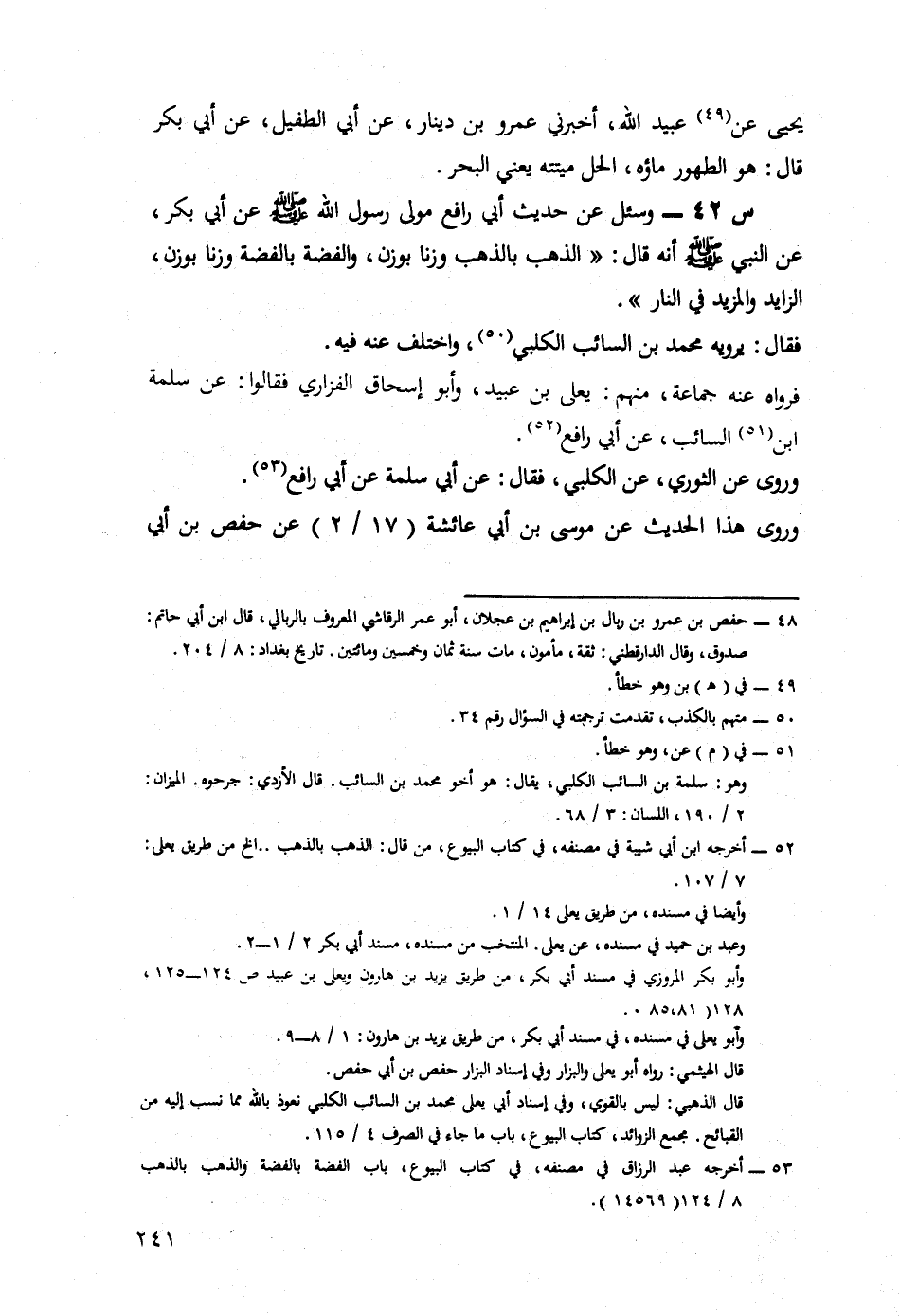 42- وَسُئِلَ عَنْ حَدِيثِ أَبِي رَافِعٍ مَوْلَى رَسُولِ اللَّهِ صَلَّى اللَّهُ عَلَيْهِ وَسَلَّمَ، عَنْ أَبِي بَكْرٍ، عَنِ النَّبِيِّ صَلَّى اللَّهُ عَلَيْهِ وسلم، أَنَّهُ قَالَ: الذَّهَبُ بِالذَّهَبِ وَزْنًا بِوَزْنٍ، وَالْفِضَّةُ بِالْفِضَّةِ وَزْنًا بِوَزْنٍ، الزَّايِدُ وَالْمُزِيدُ فِي النَّارِ.