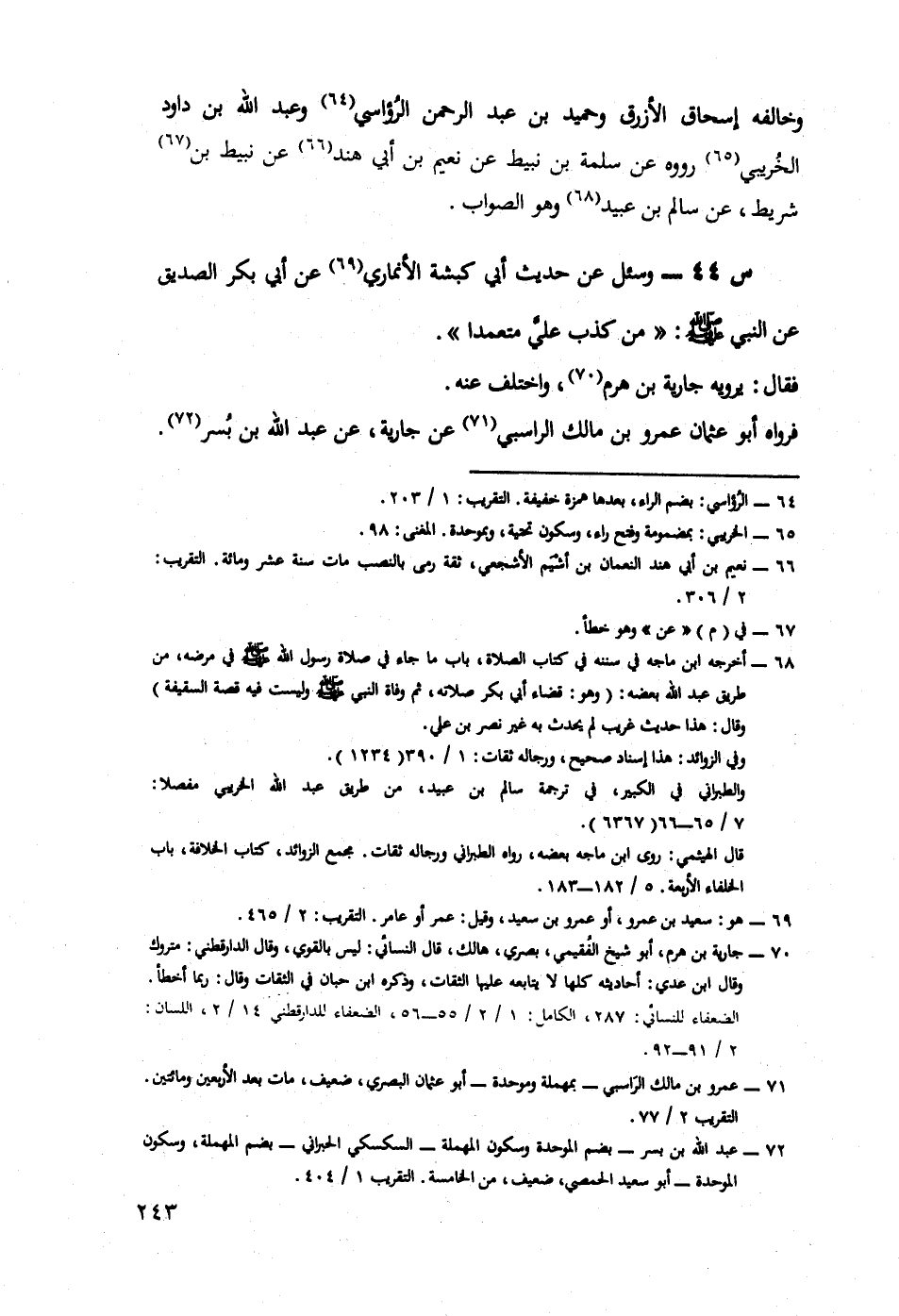 44- وَسُئِلَ عَنْ حَدِيثِ أَبِي كَبْشَةَ الْأَنْمَارِيُّ، عَنْ أَبِي بَكْرٍ الصِّدِّيقِ، عَنِ النَّبِيِّ صَلَّى اللَّهُ عَلَيْهِ وَسَلَّمَ: مَنْ كَذَبَ عَلَيَّ مُتَعَمِّدًا.