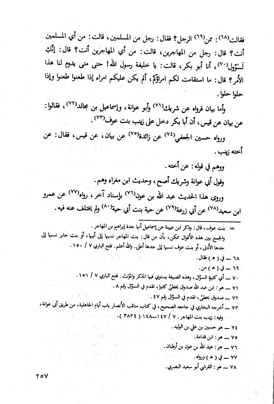 قَالَتْ مِنْ أَيِّ الْمُسْلِمِينَ أَنْتَ قَالَ رَجُلٌ مِنَ الْمُهَاجِرِينَ قَالَتْ مِنْ أَيِّ الْمُهَاجِرِينَ أَنْتَ قال إنك لسؤول أَنَا أَبُو بَكْرٍ قَالَتْ يَا خَلِيفَةَ رَسُولِ اللَّهِ حَتَّى مَتَّى يَدُومُ لَنَا هَذَا الْأَمْرُ قَالَ مَا اسْتَقَامَتْ لَكُمْ أُمَرَاؤُكُمْ أَلَمْ يَكُنْ عَلَيْكُمْ أُمَرَاءٌ إِذَا طَعَنُوا طَعَنُوا وَإِذَا حَلُّوا حَلُّوا.
