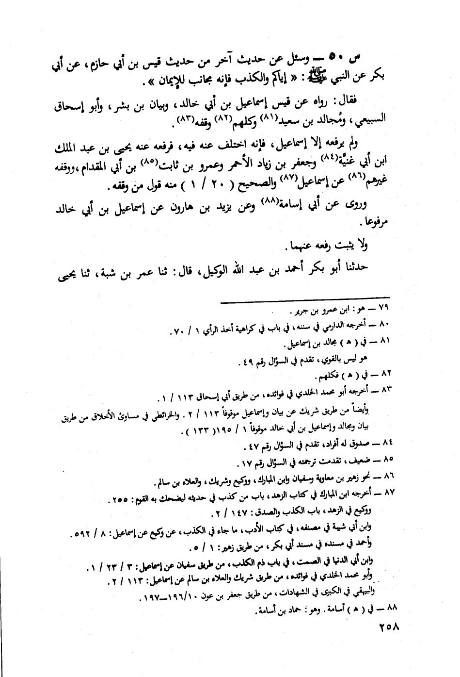 50- وَسُئِلَ عَنْ حَدِيثٍ آخَرَ مِنْ حَدِيثِ قَيْسِ بْنِ أَبِي حَازِمٍ، عَنْ أَبِي بَكْرٍ، عَنِ النَّبِيِّ صَلَّى اللَّهُ عَلَيْهِ وَسَلَّمَ: إِيَّاكُمْ وَالْكَذِبَ فَإِنَّهُ مُجَانِبٌ لِلْإِيمَانِ.