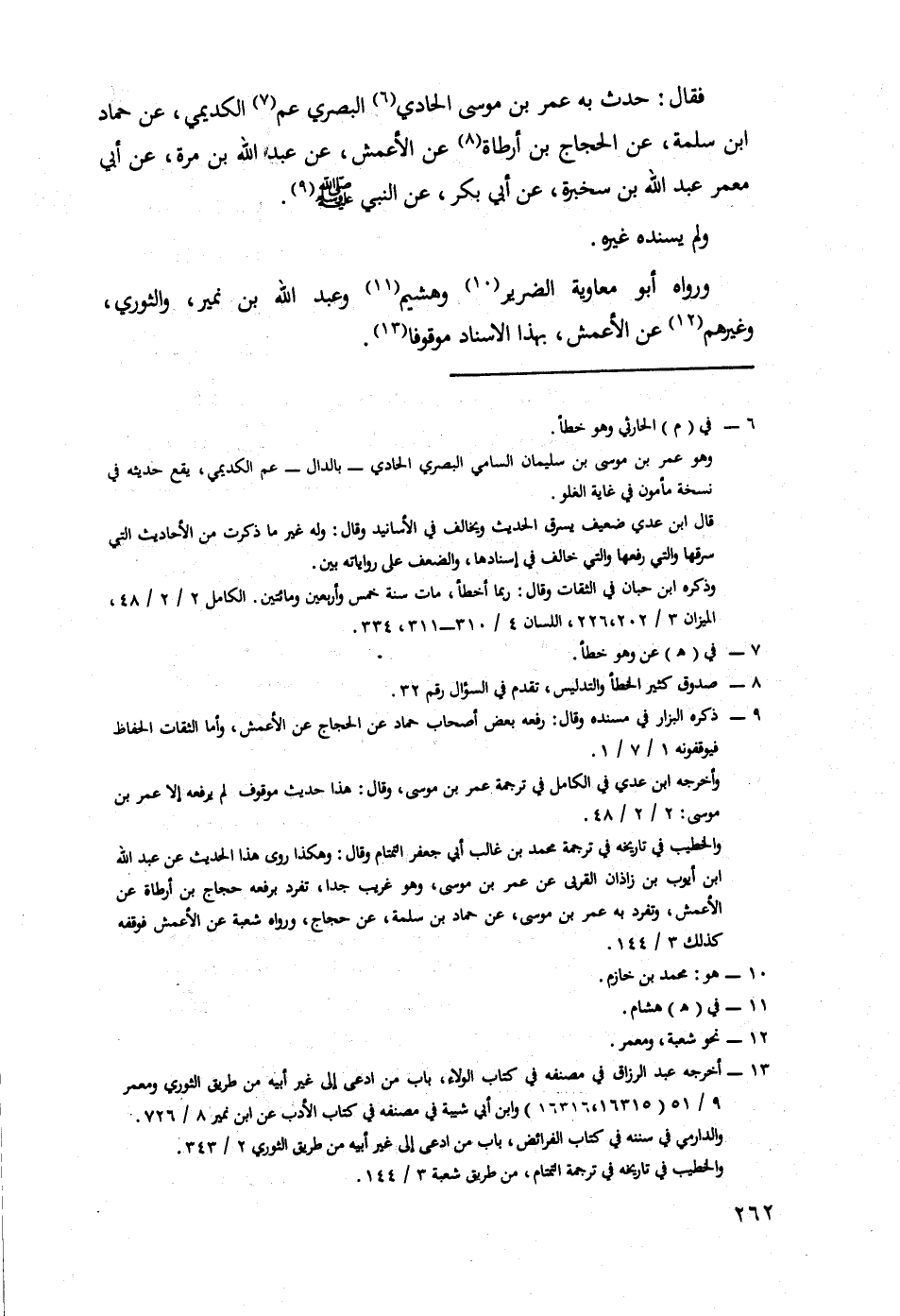فَقَالَ: حَدَّثَ بِهِ عُمَرُ بْنُ مُوسَى الْحَادِي الْبَصْرِيُّ عَمُّ الْكُدَيْمِيِّ، عَنْ حَمَّادِ بْنِ سَلَمَةَ، عَنِ الْحَجَّاجِ بْنِ أَرْطَأَةَ، عَنِ الْأَعْمَشِ، عَنْ عَبْدِ اللَّهِ بْنِ مُرَّةَ، عَنْ أَبِي مَعْمَرٍ عَبْدِ اللَّهِ بْنِ سَخْبَرَةَ، عن أَبِي بَكْرٍ، عَنِ النَّبِيِّ صَلَّى اللَّهُ عَلَيْهِ وَسَلَّمَ.