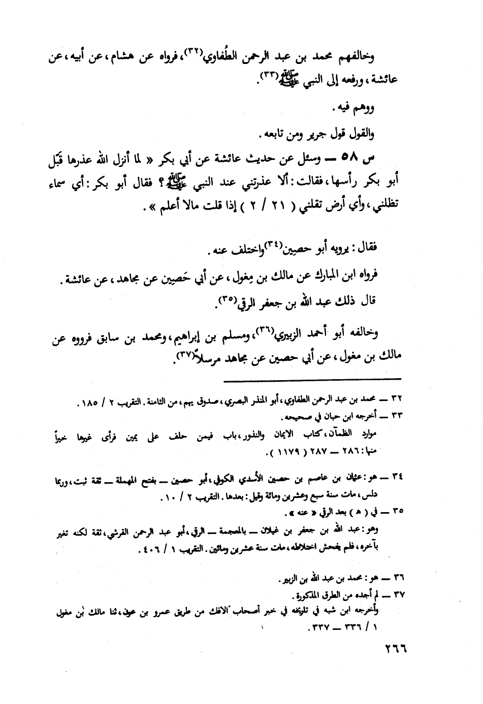 58- وَسُئِلَ عَنْ حَدِيثِ عَائِشَةَ، عَنْ أَبِي بَكْرٍ لَمَّا أَنْزَلَ اللَّهُ عُذْرَهَا قَبَّلَ أَبُو بَكْرٍ رَأْسَهَا فَقَالَتْ أَلَا عَذَرَتْنِي عِنْدَ النَّبِيِّ صَلَّى اللَّهُ عَلَيْهِ وَسَلَّمَ فَقَالَ أَبُو بَكْرٍ أَيُّ سَمَاءٍ تُظِلُّنِي وَأَيُّ أَرْضٍ تُقِلُّنِي إِذَا قُلْتُ مَالَا أَعْلَمُ.