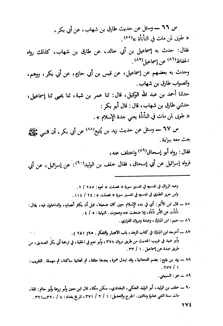 66- وسئل عن حديث طارق بن شهاب، عن أَبِي بَكْرٍ طُوبَى لِمَنْ مَاتَ فِي النَّأْنَأَةِ.