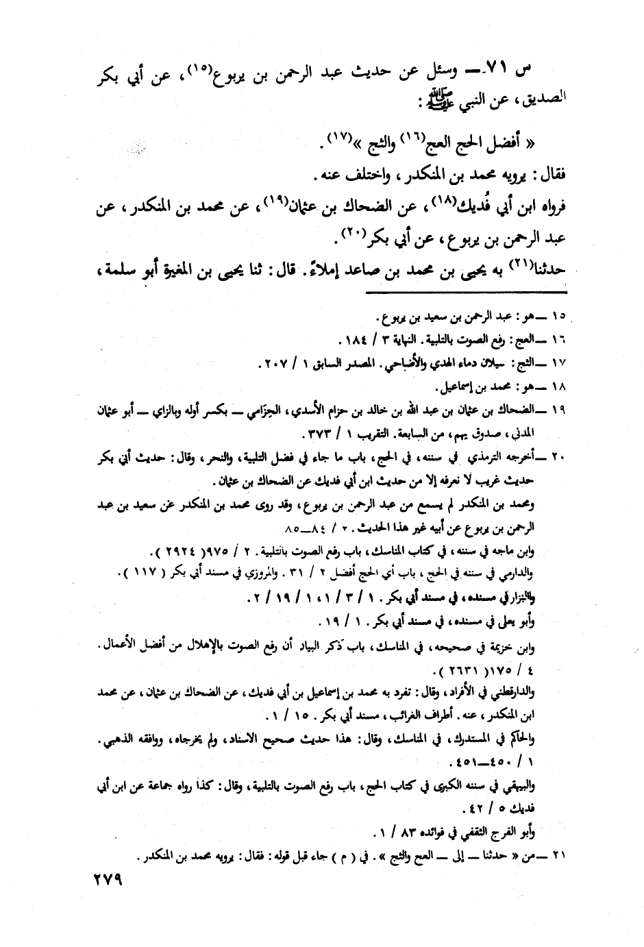 71- وَسُئِلَ عَنْ حَدِيثِ عَبْدِ الرَّحْمَنِ بْنِ يَرْبُوعٍ، عَنْ أَبِي بَكْرٍ الصِّدِّيقِ، عَنِ النَّبِيِّ صَلَّى اللَّهُ عَلَيْهِ وَسَلَّمَ: أَفْضَلُ الْحَجِّ الْعَجُّ وَالثَّجُّ.