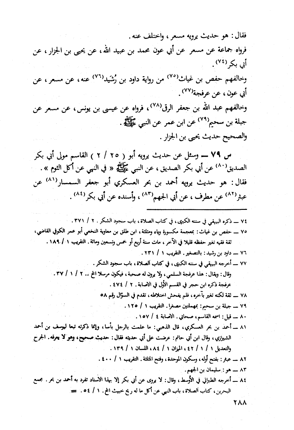 78- وَسُئِلَ عَنْ حَدِيثِ يَحْيَى بْنِ الْجَزَّارِ، عَنْ أَبِي بَكْرٍ أَنَّهُ مَرَّ بِرَجُلٍ بِهِ زَمَانَةٌ فَسَجَدَ.