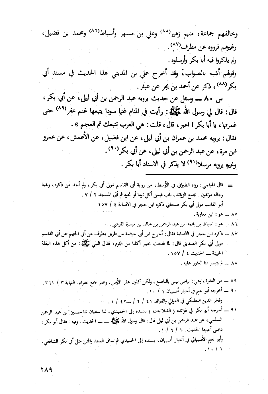 80- وَسُئِلَ عَنْ حَدِيثٍ يَرْوِيهِ عَبْدُ الرَّحْمَنِ بْنُ أَبِي لَيْلَى، عَنْ أَبِي بَكْرٍ، قَالَ: قَالَ لِي رَسُولُ اللَّهِ صَلَّى اللَّهُ عَلَيْهِ وسلم: رَأَيْتُ فِي الْمَنَامِ غَنَمًا سُودًا يَتْبَعُهَا غَنَمٌ عُفْرٌ حَتَّى غَمَرَتْهَا، يَا أَبَا بَكْرٍ اعْبُرْ قَالَ: قُلْتُ: هِيَ الْعَرَبُ تَتْبَعُكَ ثُمَّ الْعَجَمُ.