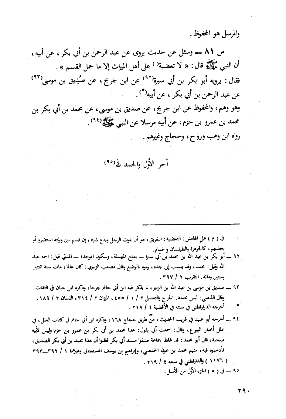 81- وَسُئِلَ عَنْ حَدِيثٍ يَرْوِي، عَنْ عَبْدِ الرَّحْمَنِ بْنِ أَبِي بَكْرٍ، عَنْ أَبِيهِ؛ أَنّ النَّبِيَّ صَلَّى اللَّهُ عَلَيْهِ وَسَلَّمَ، قَالَ: لَا تَعْضِيَةَ عَلَى أَهْلِ الْمِيرَاثِ إِلَّا مَا حَمَلَ الْقَسْمَ.