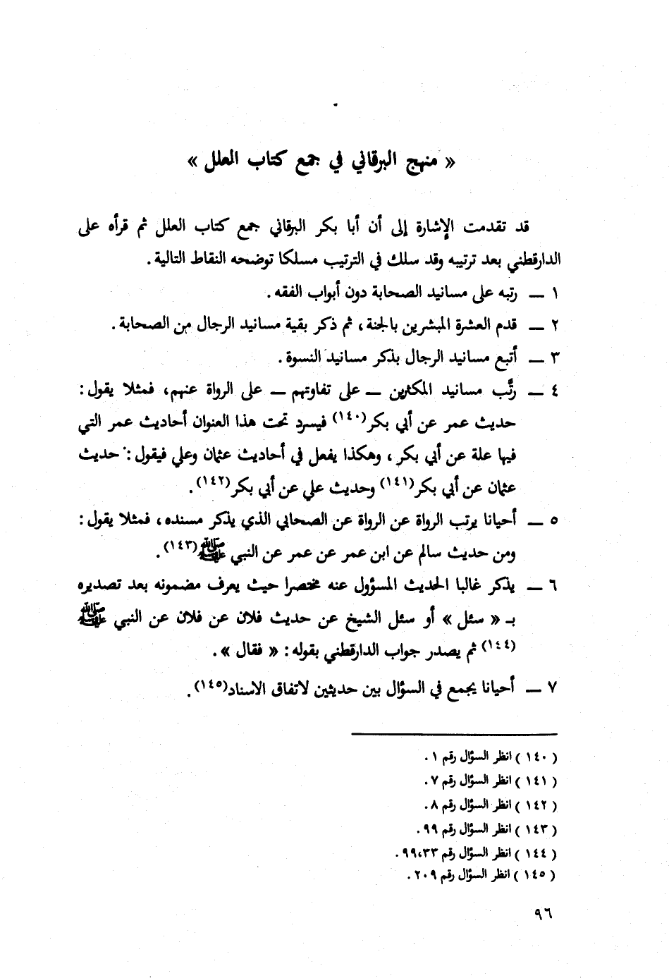 6 - يذكر غالبا الحديث المسؤول عنه مختصرا حيث يعرف مضمونه بعد تصديره ب " سئل " أَو سئل الشيخ عن حديث فلان عن فلان عنِ النَّبي صَلى اللَّهُ عَليه وسَلمَ (144) ثُمَّ يصدر جواب الدارقطني بقوله: " فقال ".