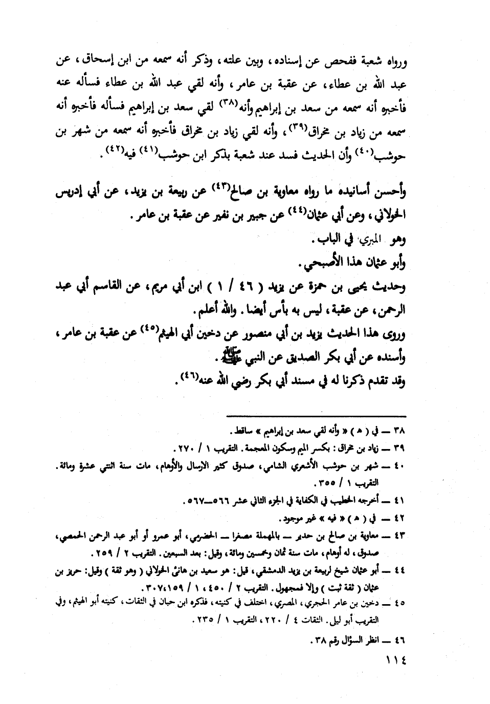 وَرَوَاهُ شُعْبَةُ، فَفَحَصَ عَنْ إِسْنَادِهِ، وَبَيَّنَ عِلَّتَهُ وذكر أنه سمعه من أَبِي إِسْحَاقَ (1) ، عَنْ عَبْدِ اللَّهِ بْنِ عَطَاءٍ، عَنْ عُقْبَةَ بْنِ عَامِرٍ، وَأَنَّهُ لَقِيَ عَبْدَ اللَّهِ بْنَ عَطَاءٍ فَسَأَلَهُ عَنْهُ، فَأَخْبَرَهُ أَنَّهُ سَمِعَهُ مِنْ سَعْدِ بْنِ إِبْرَاهِيمَ، وَأَنَّهُ لَقِيَ سَعْدَ بْنَ إِبْرَاهِيمَ، فَسَأَلَهُ فَأَخْبَرَهُ أَنَّهُ سَمِعَهُ مِنْ زِيَادِ بْنِ مِخْرَاقٍ، وَأَنَّهُ لَقِيَ زِيَادَ بْنَ مِخْرَاقٍ، فَأَخْبَرَهُ أَنَّهُ سَمِعَهُ مِنْ شَهْرِ بْنِ حَوْشَبٍ، وَأَنَّ الْحَدِيثَ فُسِدَ عِنْدَ شُعْبَةَ بذكر ابن حَوْشَبٍ فِيهِ.