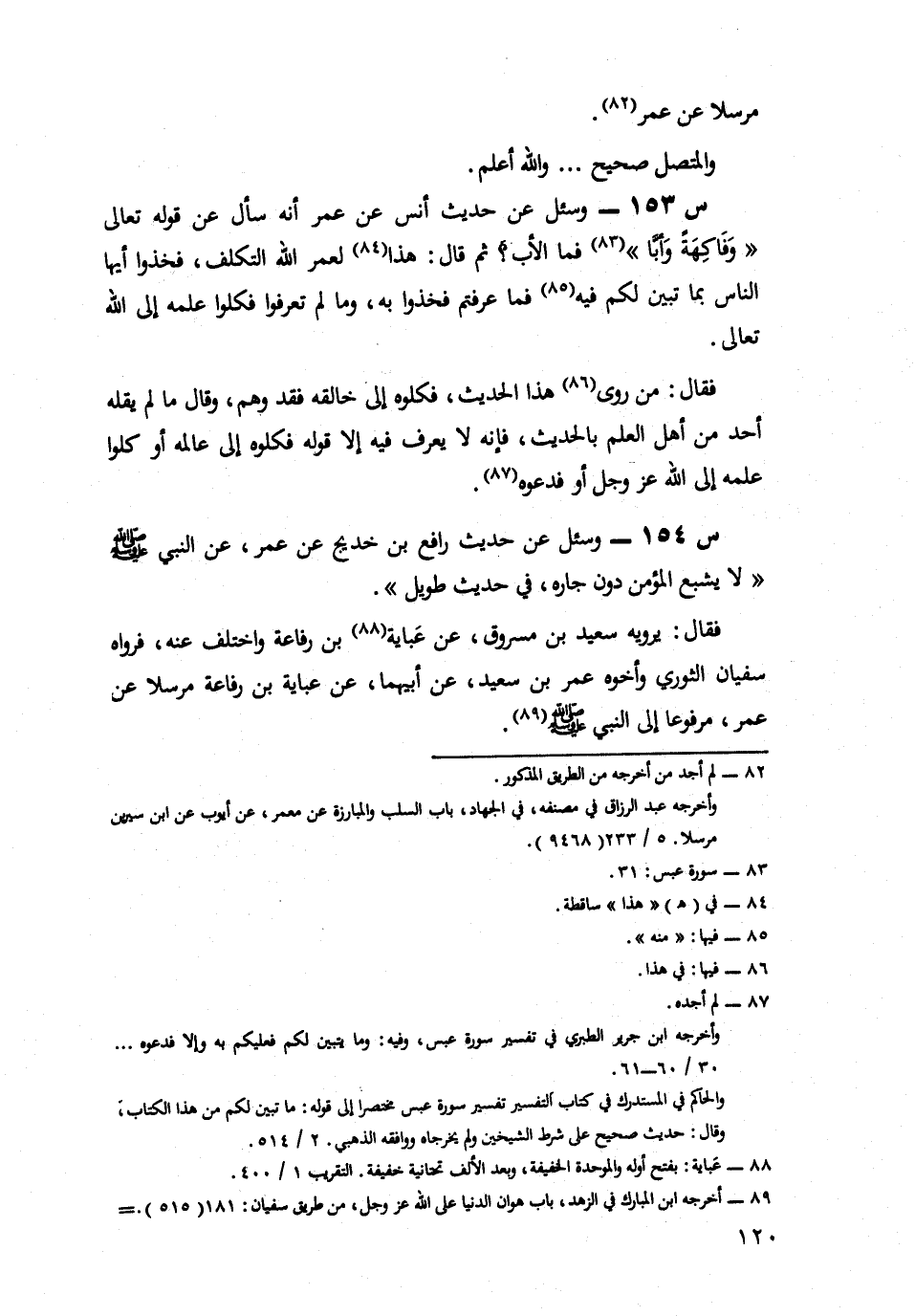 153- وَسُئِلَ عَنْ حَدِيثِ أَنَسٍ، عَنْ عُمَرَ أَنَّهُ سأل عن قوله تعالى: {وفاكهة وأبا} فَمَا الْأَبُّ ثُمَّ قَالَ هَذَا لِعَمْرُ اللَّهِ التَّكَلُّفُ فَخُذُوا أَيُّهَا النَّاسَ بِمَا تَبَيَّنَ لَكُمْ فِيهِ فَمَا عَرَفْتُمْ فَخُذُوا بِهِ وَمَا لَمْ تَعْرِفُوا فَكِلُوا عِلْمَهُ إِلَى اللَّهِ تَعَالَى.