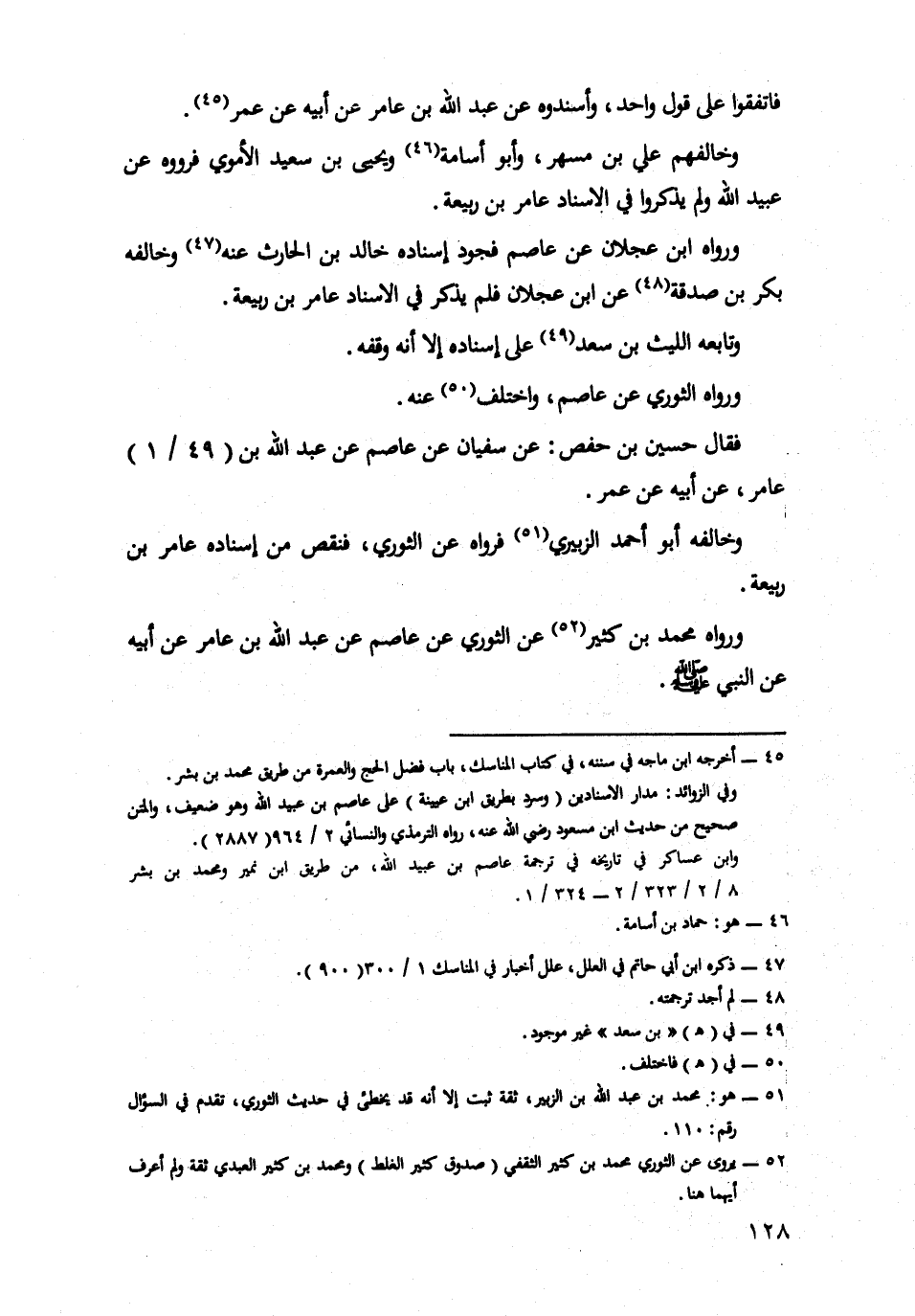 فَقَالَ حُسَيْنُ بْنُ حَفْصٍ: عَنْ سُفْيَانَ، عَنْ عَاصِمٍ، عَنْ عبد الله بن عامر، عن أبيه، عن عُمَرَ.