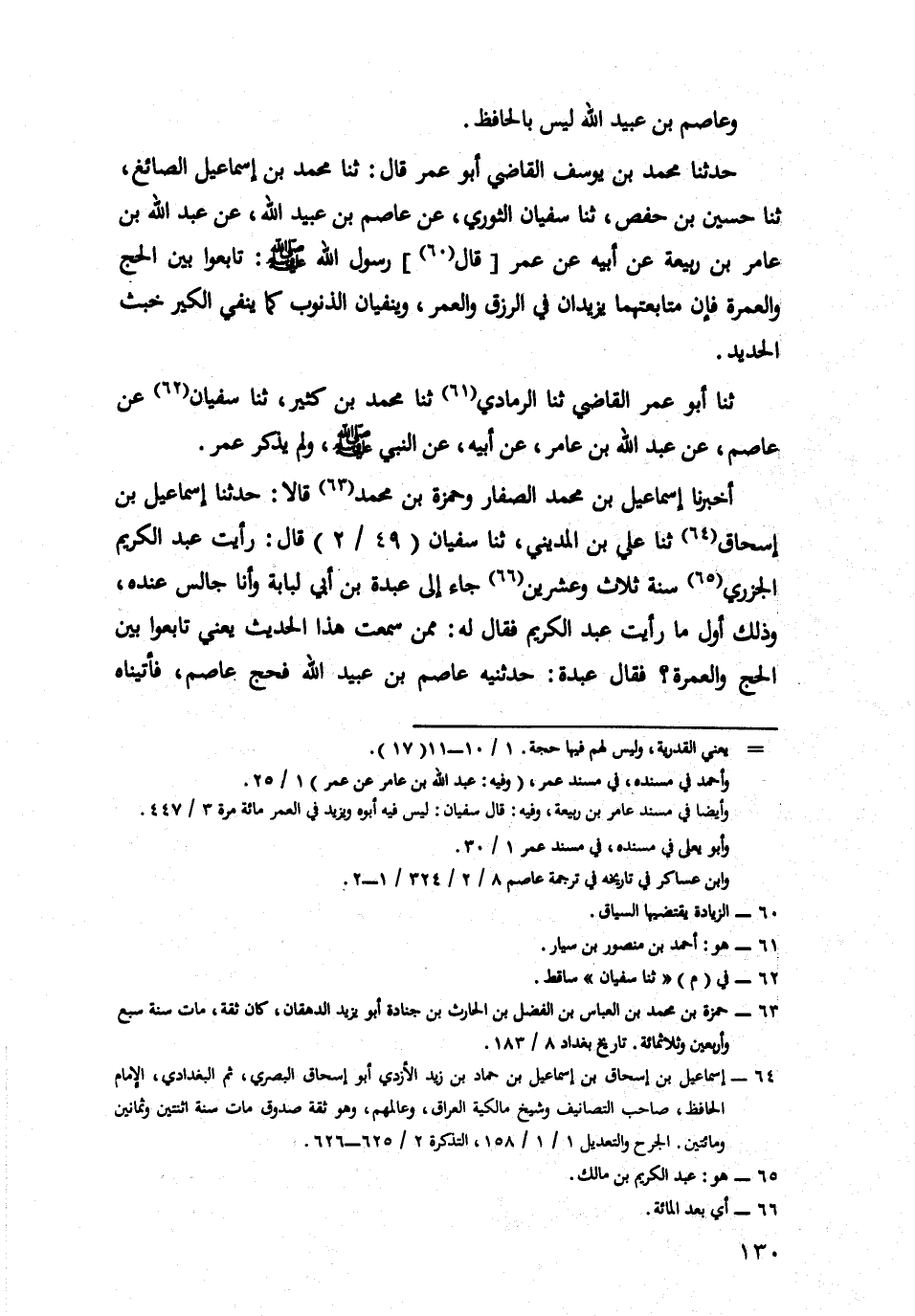 حَدَّثَنَا مُحَمَّدُ بْنُ يُوسُفَ الْقَاضِي أَبُو عُمَرَ، قَالَ: حدثنا محمد بن إسماعيل الصائغ، حدثنا حسين بن حفص، حدثنا سُفْيَانُ الثَّوْرِيُّ، عَنْ عَاصِمِ بْنِ عُبَيْدِ اللَّهِ، عَنْ عَبْدِ اللَّهِ بْنِ عَامِرِ بْنِ رَبِيعَةَ، عَنْ أَبِيهِ، عَنْ عُمَرَ، قَالَ رَسُولُ اللَّهِ صَلَّى اللَّهُ عَلَيْهِ وَسَلَّمَ: تَابِعُوا بَيْنَ الْحَجِّ وَالْعُمْرَةِ، فَإِنَّ مُتَابَعَتَهُمَا يَزِيدَانِ فِي الرِّزْقِ وَالْعُمْرِ، وَيَنْفِيَانِ الذُّنُوبَ كَمَا يَنْفِي الْكِيرُ خَبَثَ الْحَدِيدِ.